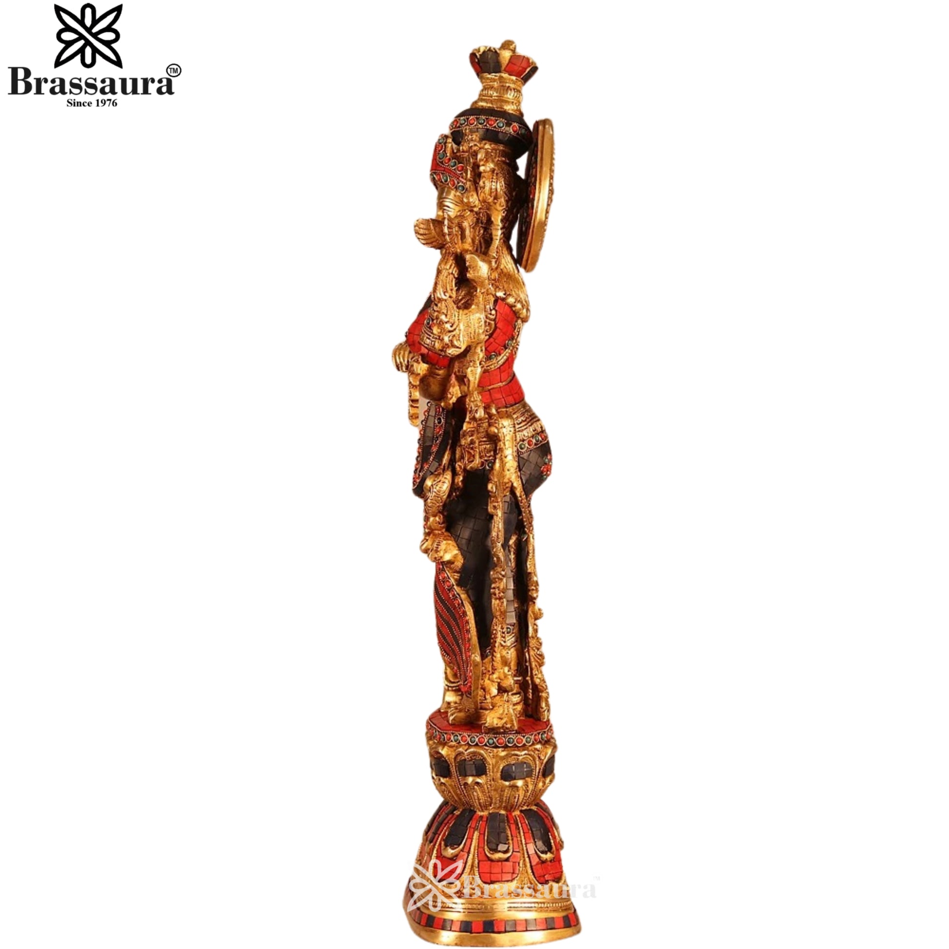 Bring home divine grace and timeless craftsmanship with this exquisite Murli Dhari Krishna Murti, meticulously crafted in solid brass. Adorned with intricate gemstone inlay work, this statue captures Lord Krishna in his iconic posture, playing the flute (Murli), radiating serenity and divine charm.