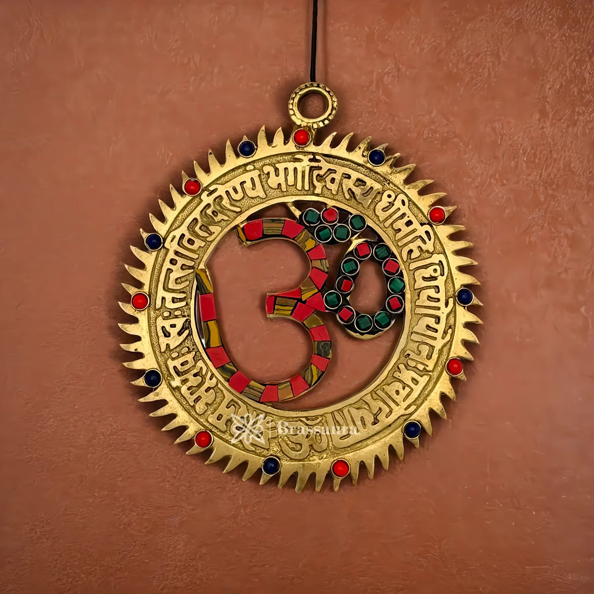 Brassaura™ Brass Gemstone Work Om Wall Hanging Idol – Height 6 Inches & Weight 0.3 Kgs | Spiritual Home Décor