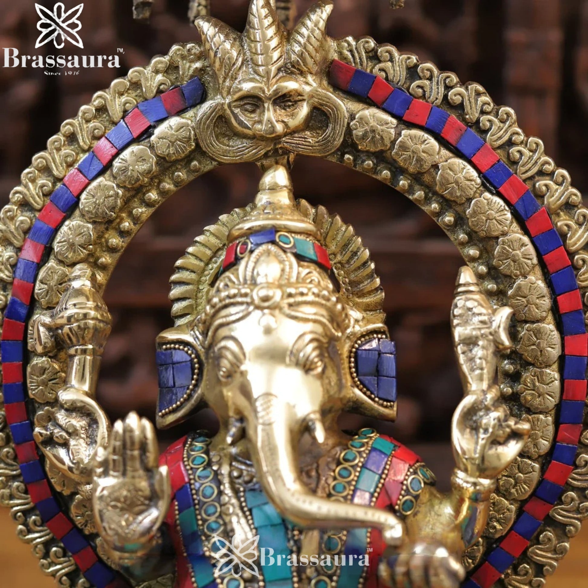 Radiating divine elegance and artistic brilliance, this Brass Gemstone Work Ring Ganesha Statue features Lord Ganesha seated within a beautifully crafted ornamental ring.