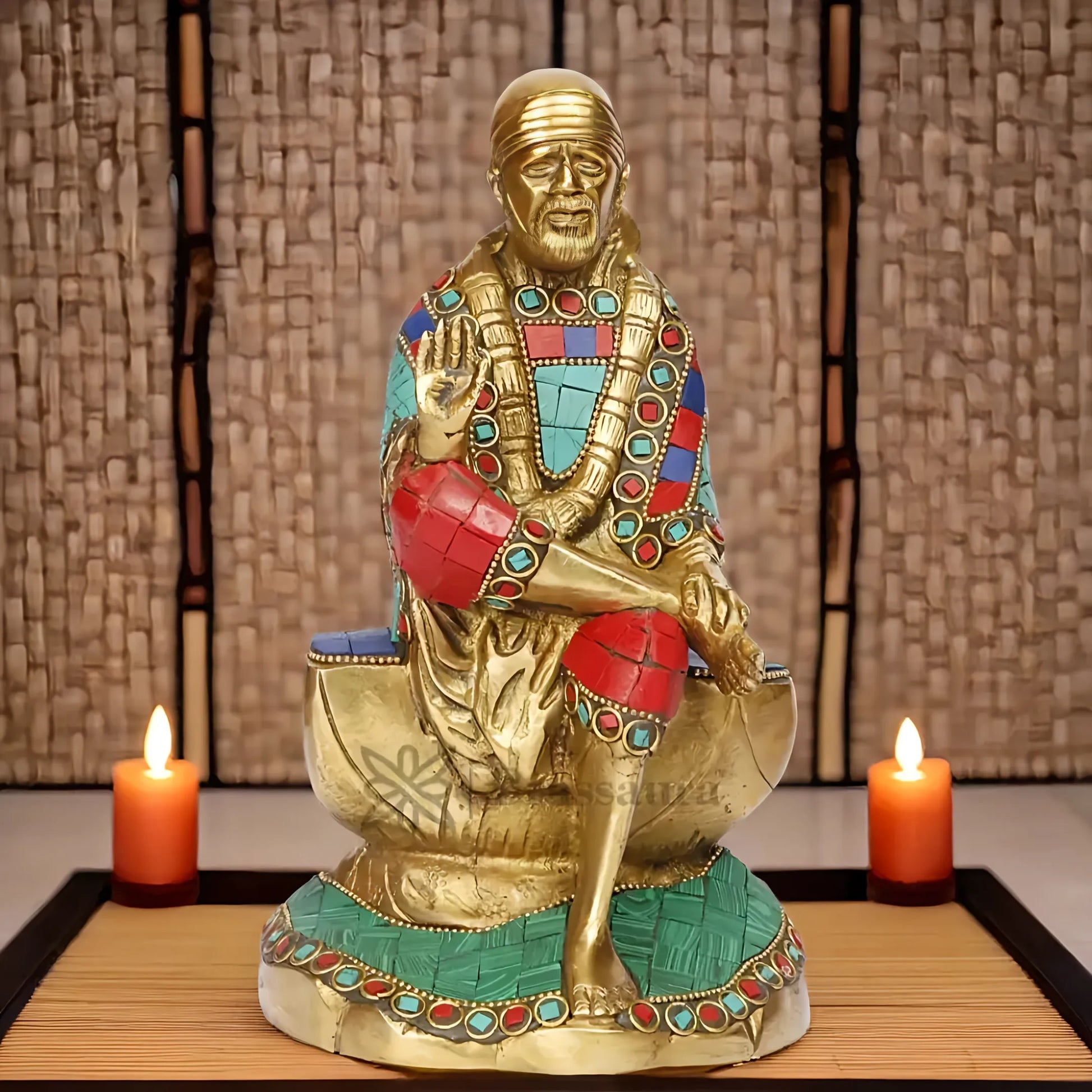 Brassaura™ Brass Gem Stone Work Sai Baba Idol – Height 9 Inches & Weight 2.4 Kgs | Devotional Masterpiece for Home Temple Décor