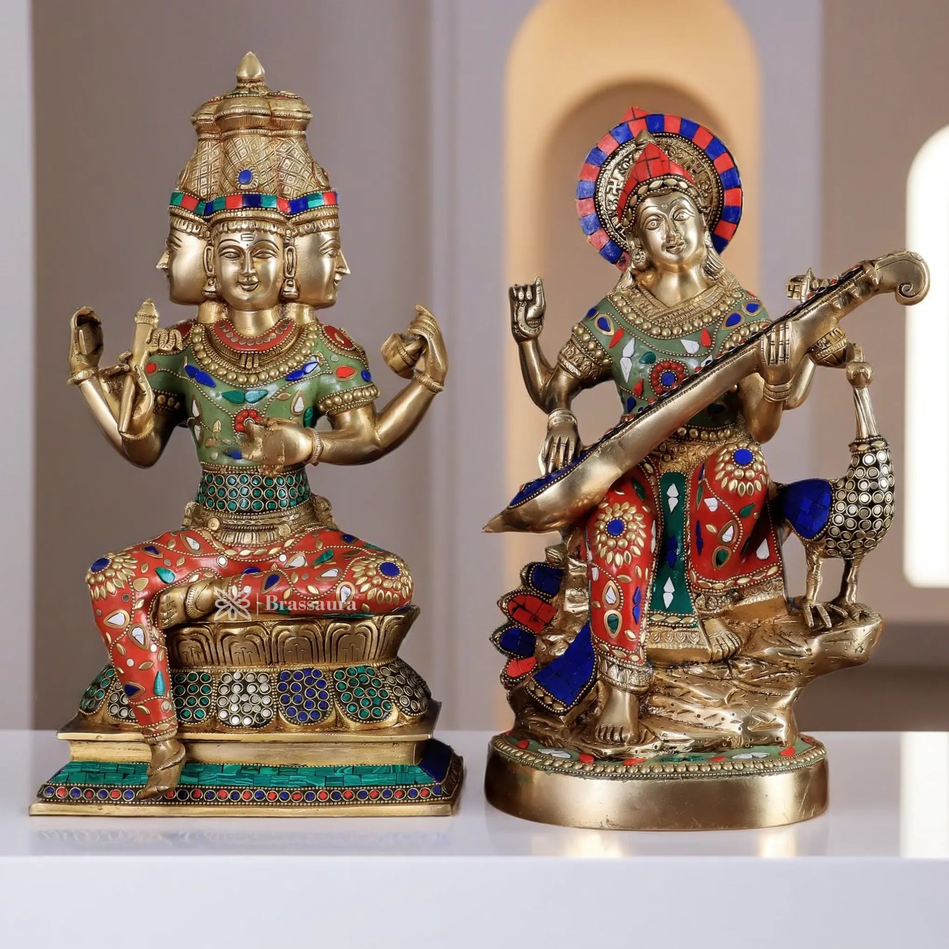 Brassaura™ Brass Gem Stone Work Saraswati & Lord Brahma For Puja Room Height 15 Inches & Weight 20 Kgs
