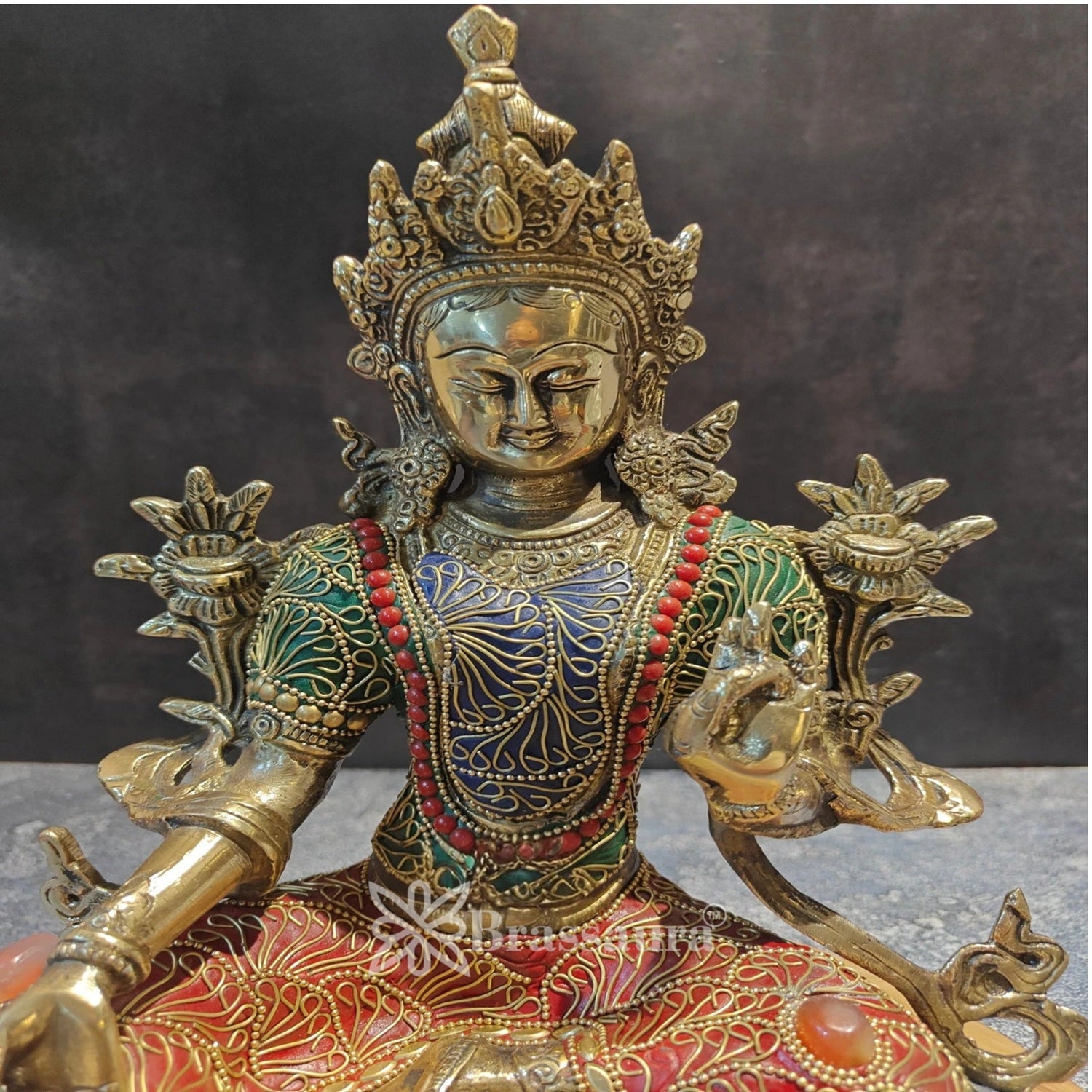 Rich in detail and spiritual grace, this Brass Gem Stone Work Tara statue stands 13 inches tall and weighs 4.8 kg. Handcrafted from solid brass and adorned with vibrant gemstone inlay, it beautifully captures the divine compassion and enlightened energy of Goddess Tara.