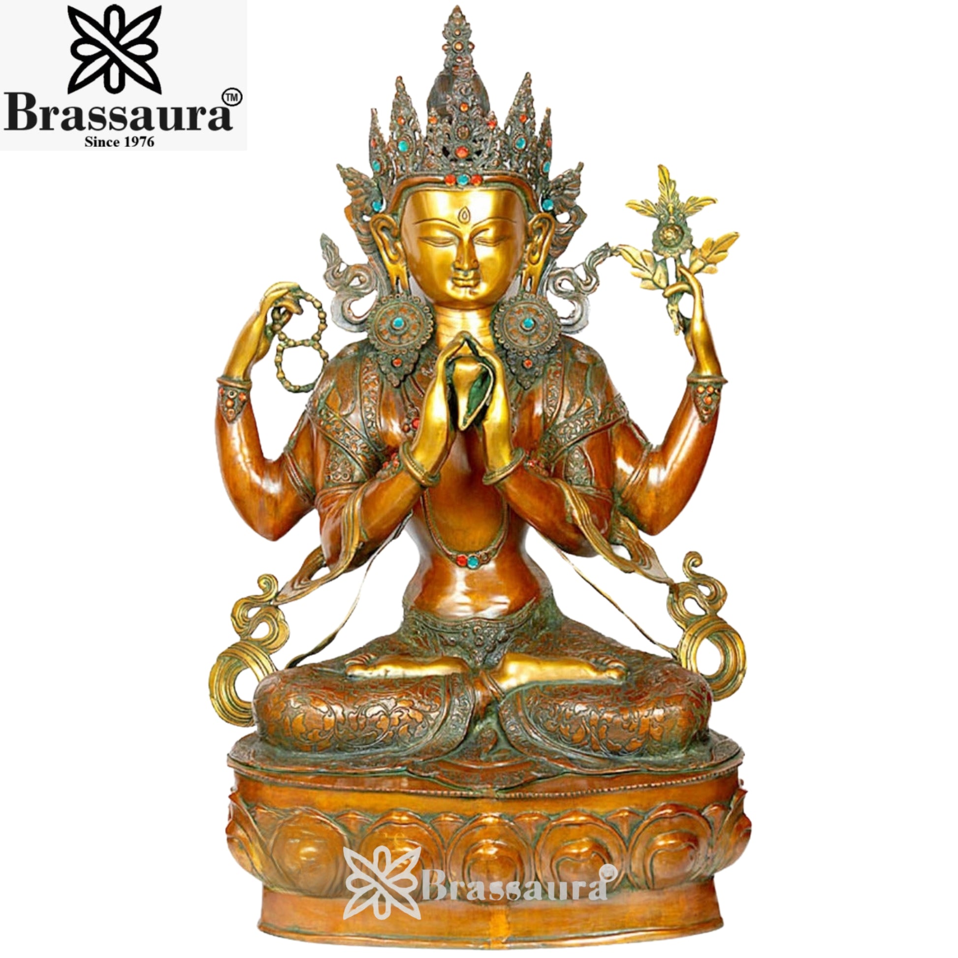 Majestic and spiritually enriching, this Brass Gem Stone Work Tara statue is a grand embodiment of divine beauty and compassion. Standing 38.5 inches tall and weighing 49 kg, this masterpiece is meticulously handcrafted from solid brass and adorned with vibrant gemstone inlay that enhances its sacred presence with a touch of regal elegance.
