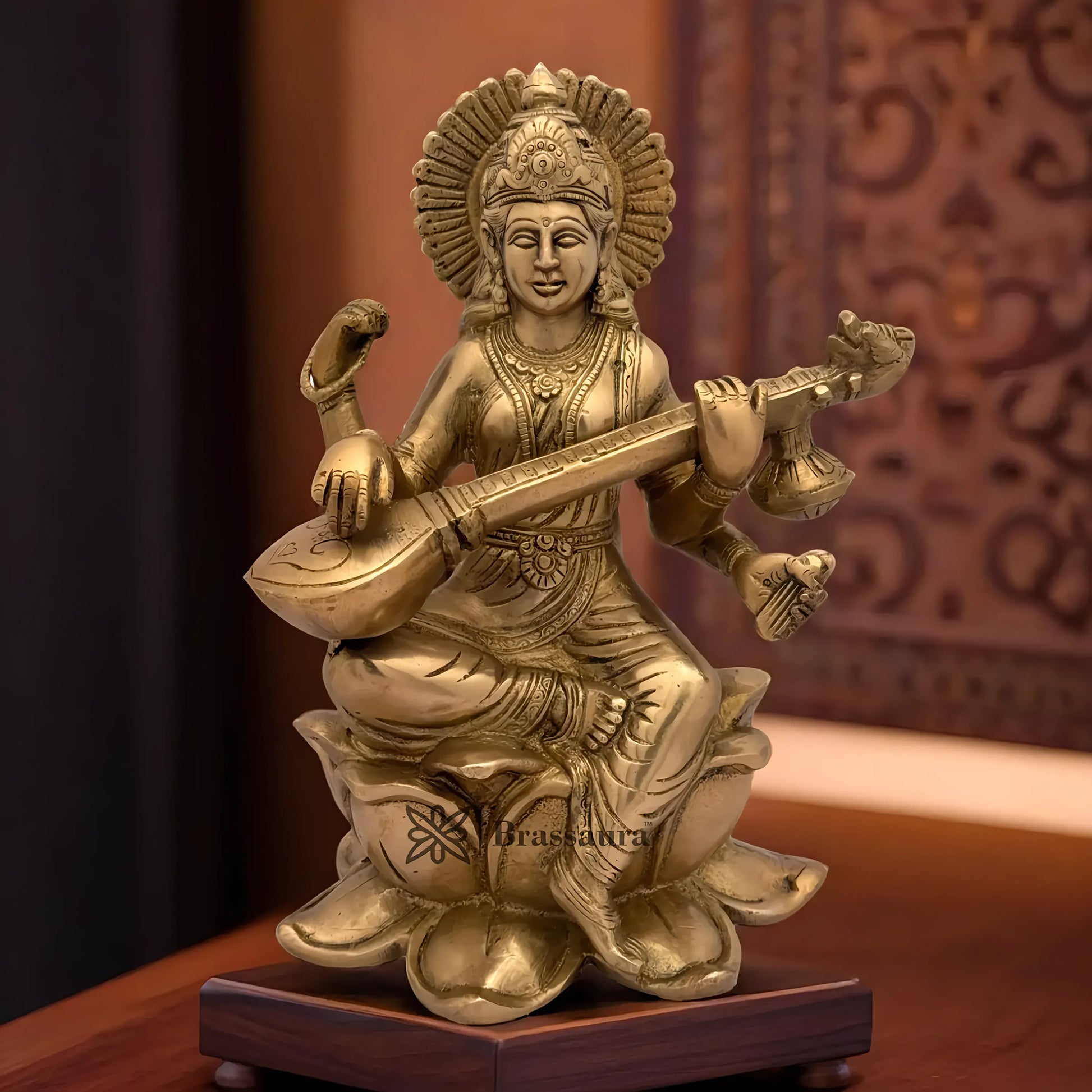 Brassaura™ Brass Saraswati Mata Statue – Height 5.2 Inches & Weight 3.6 Kgs | Temple Décor Accent