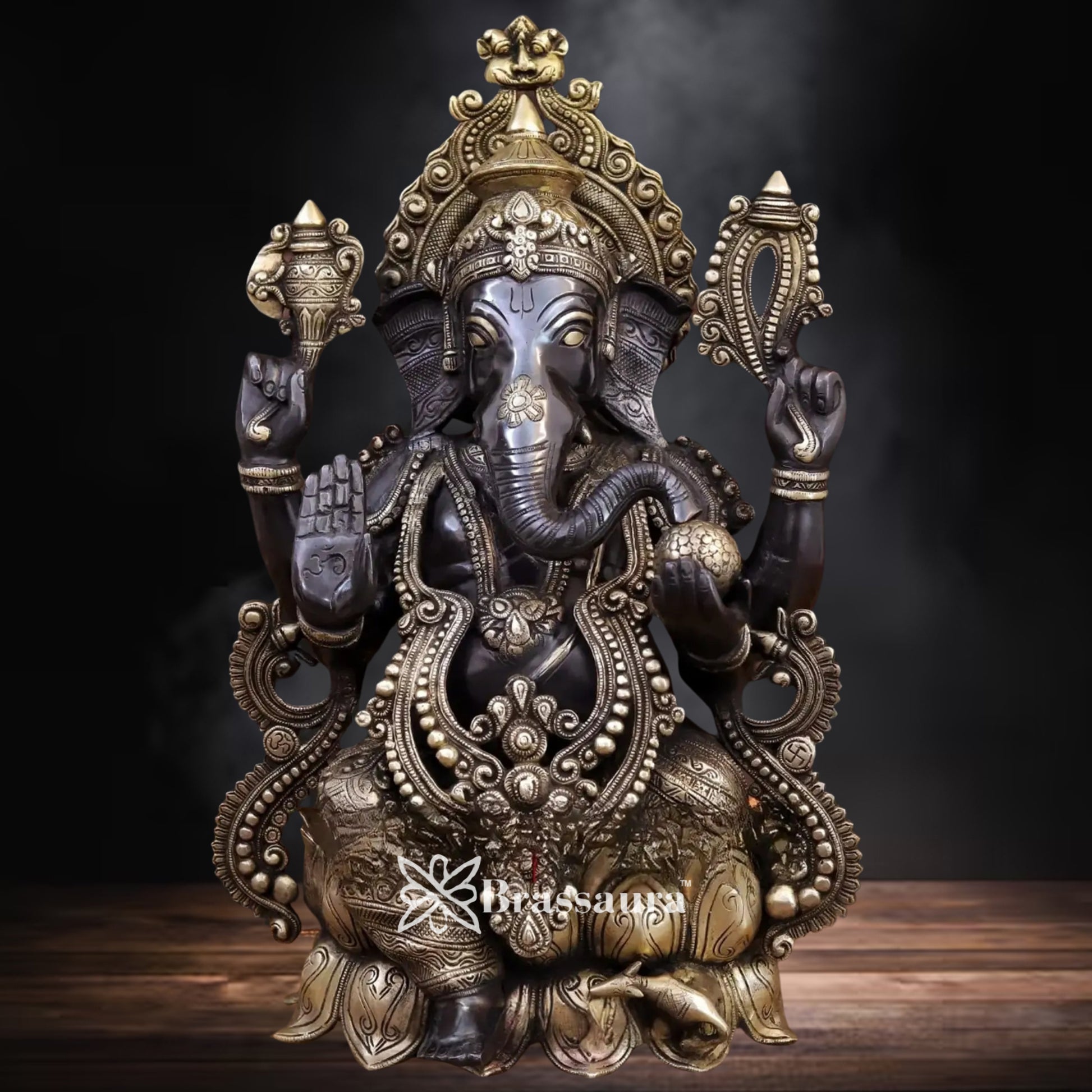 Standing 21 inches tall and weighing 20.5 kg, this exquisite idol depicts Lord Ganesha adorned with ornate jewellery detailing, symbolizing abundance, wisdom, and auspicious beginnings. Meticulously handcrafted from premium solid brass, the intricate embellishments and regal posture make it a striking centerpiece for home altars, temples, or as a cherished spiritual gift that radiates grace and positive energy.