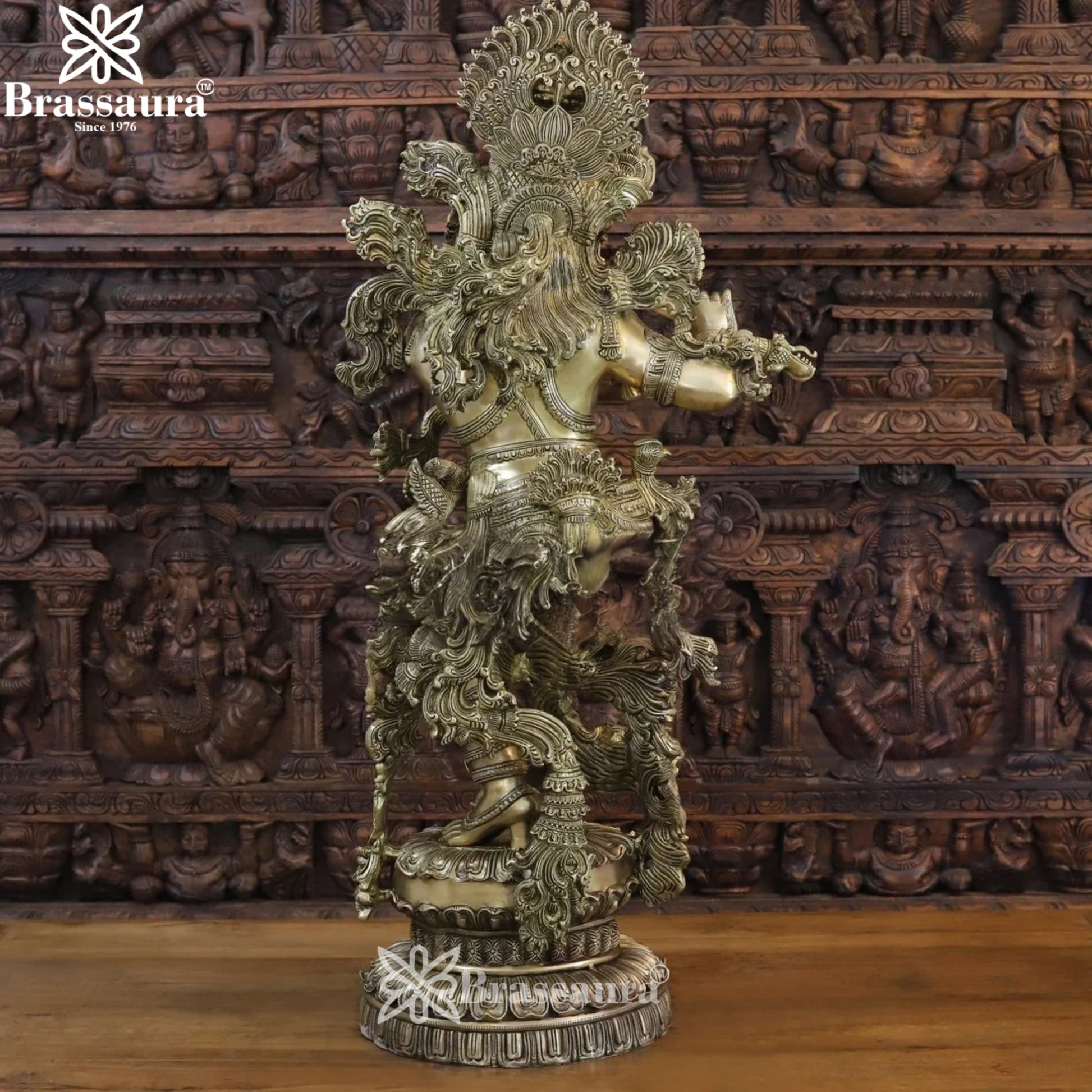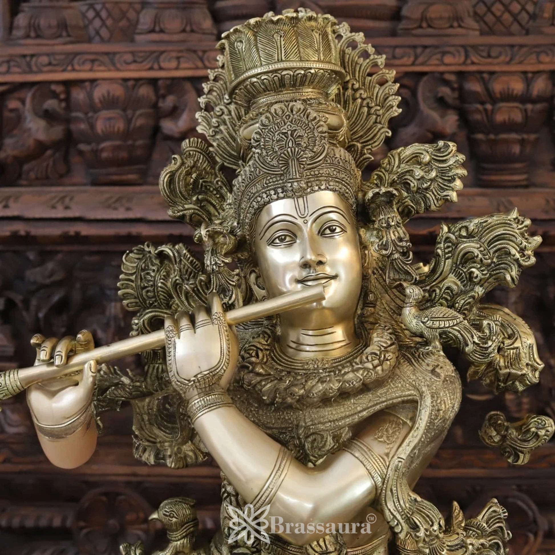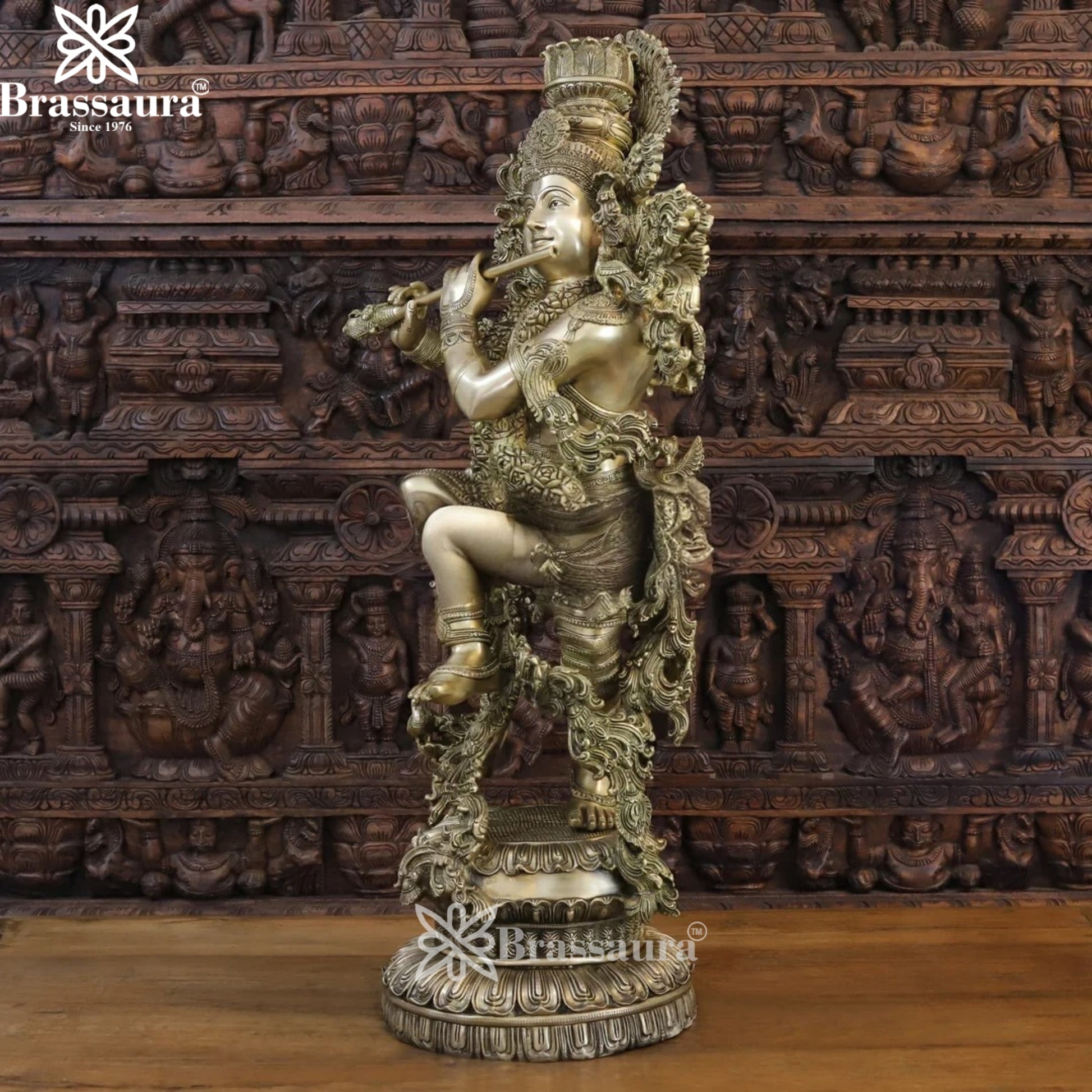 Invite grandeur and divine blessings into your space with this magnificent Brass Krishna Murti. Handcrafted from premium quality brass, this impressive idol of Lord Krishna stands tall with exquisite detailing and a serene expression, radiating peace, love, and spiritual energy. Its substantial size and fine craftsmanship make it a perfect centerpiece for temples, spiritual spaces, or luxurious decor.