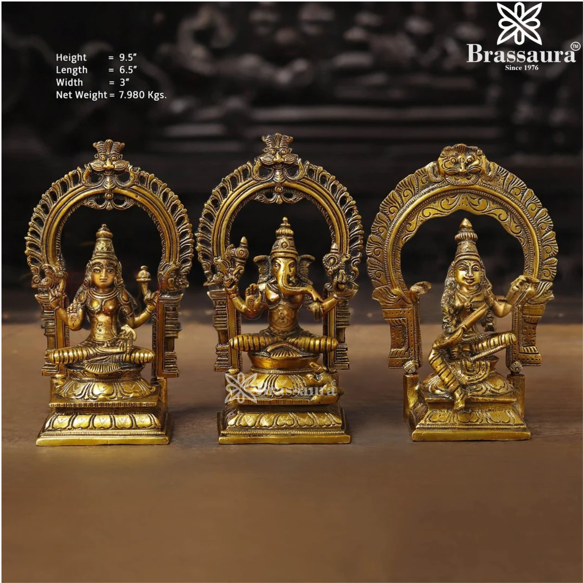 Brass Lakshmi Ganesh Saraswati Murti – 7.98 Kg, 9.5 Inches