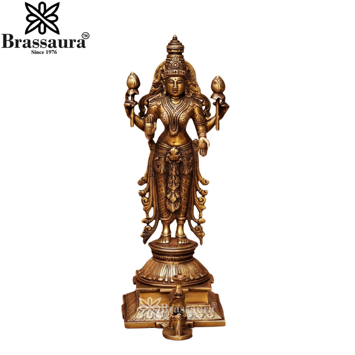 Brassaura™ Traditional Brass Laxmi Idol – Height 15 Inches & Weight 4.7 Kgs | Hindu Devotional Murti