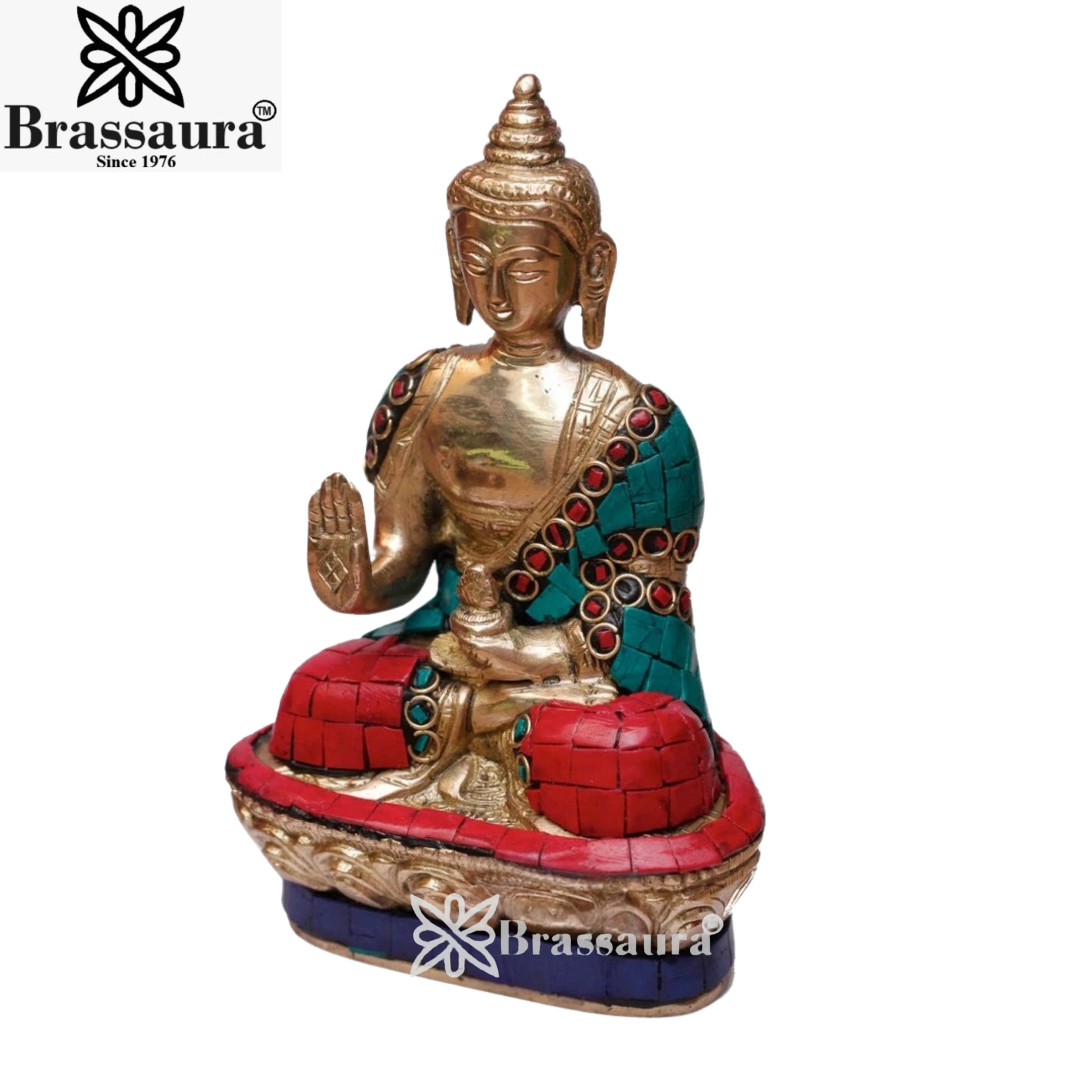 Compact yet spiritually radiant, this Brass Blessing Gemstone Work Buddha stands 7 Inch tall and weighs 1 kg. Meticulously crafted from solid brass and adorned with vibrant gemstone inlay, the statue captures the Buddha in the Abhaya Mudra—a powerful symbol of protection, peace, and fearless energy.