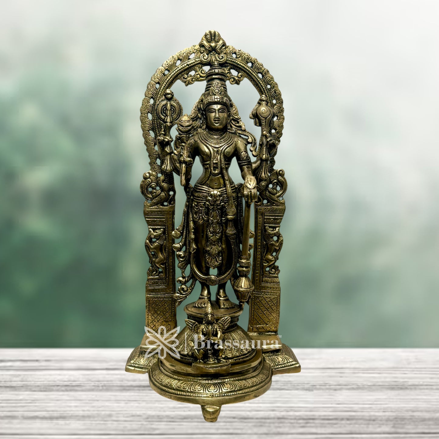 - The idol features intricate detailing, showcasing Lord Vishnu’s divine symbols: