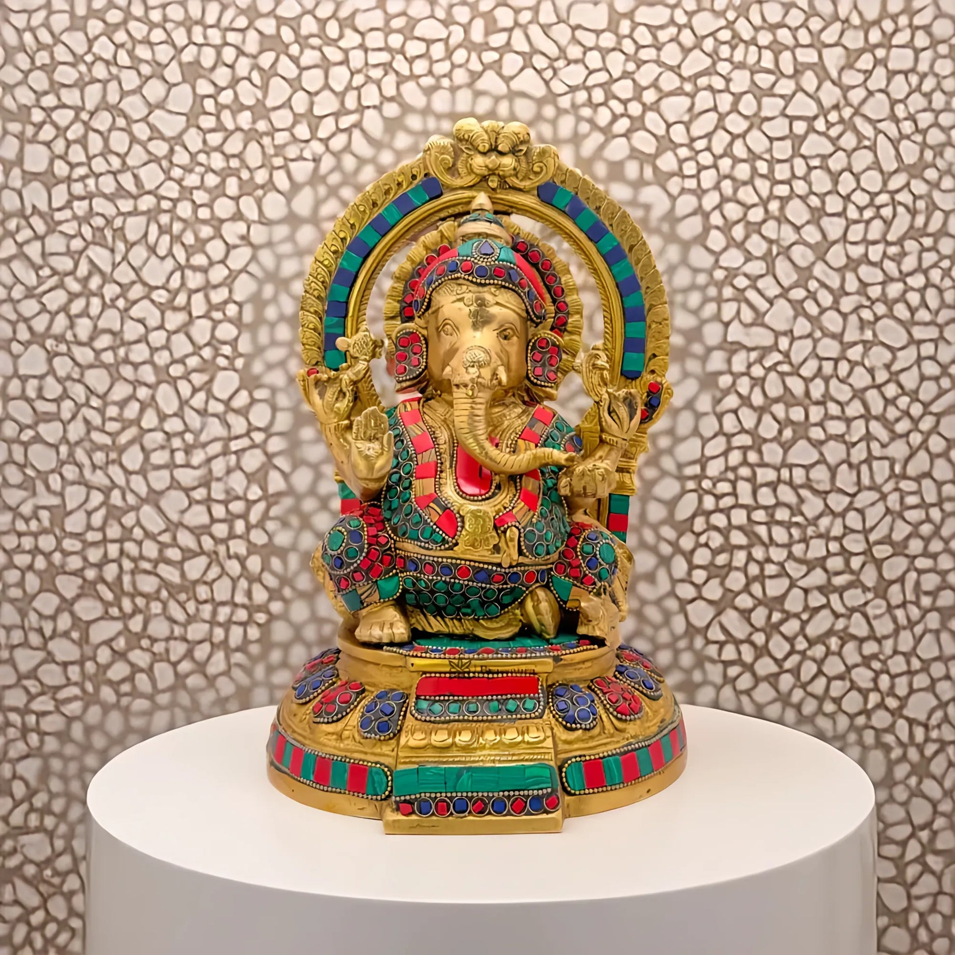 This magnificent handcrafted brass Ganesha Murti, enhanced with gemstone detailing, radiates divine charm and artistic excellence. Ideal for home temples, entrance décor, or gifting, it brings blessings of wisdom, prosperity, and positive energy to your surroundings.