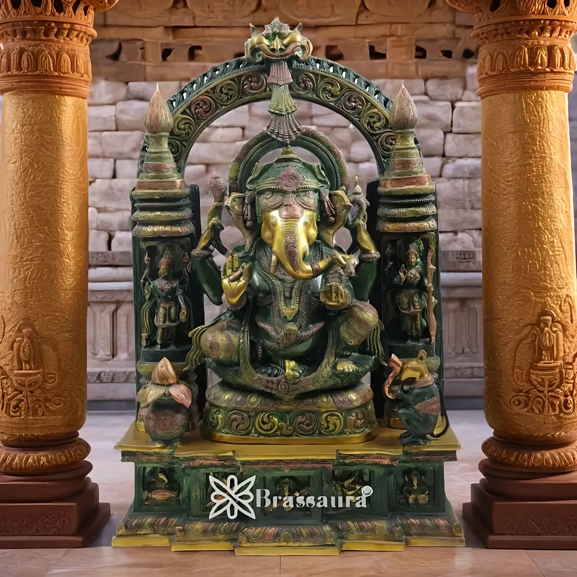 This magnificent brass Ganesha statue radiates divine grace and regal charm. Expertly handcrafted by skilled artisans, it showcases intricate detailing and a rich antique finish that enhances its grandeur—perfect for temple décor, meditation spaces, or as a statement centerpiece in your home.