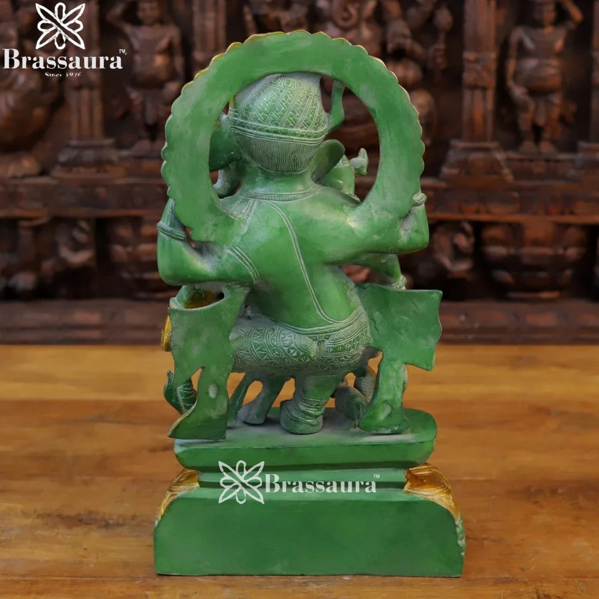 Standing 17 inches tall and weighing 13.6 kg, this handcrafted idol features Lord Ganesha seated within an ornate brass halo (prabhavali), symbolizing the cosmic cycle and spiritual enlightenment. A perfect centerpiece for home temples or meditation spaces.
