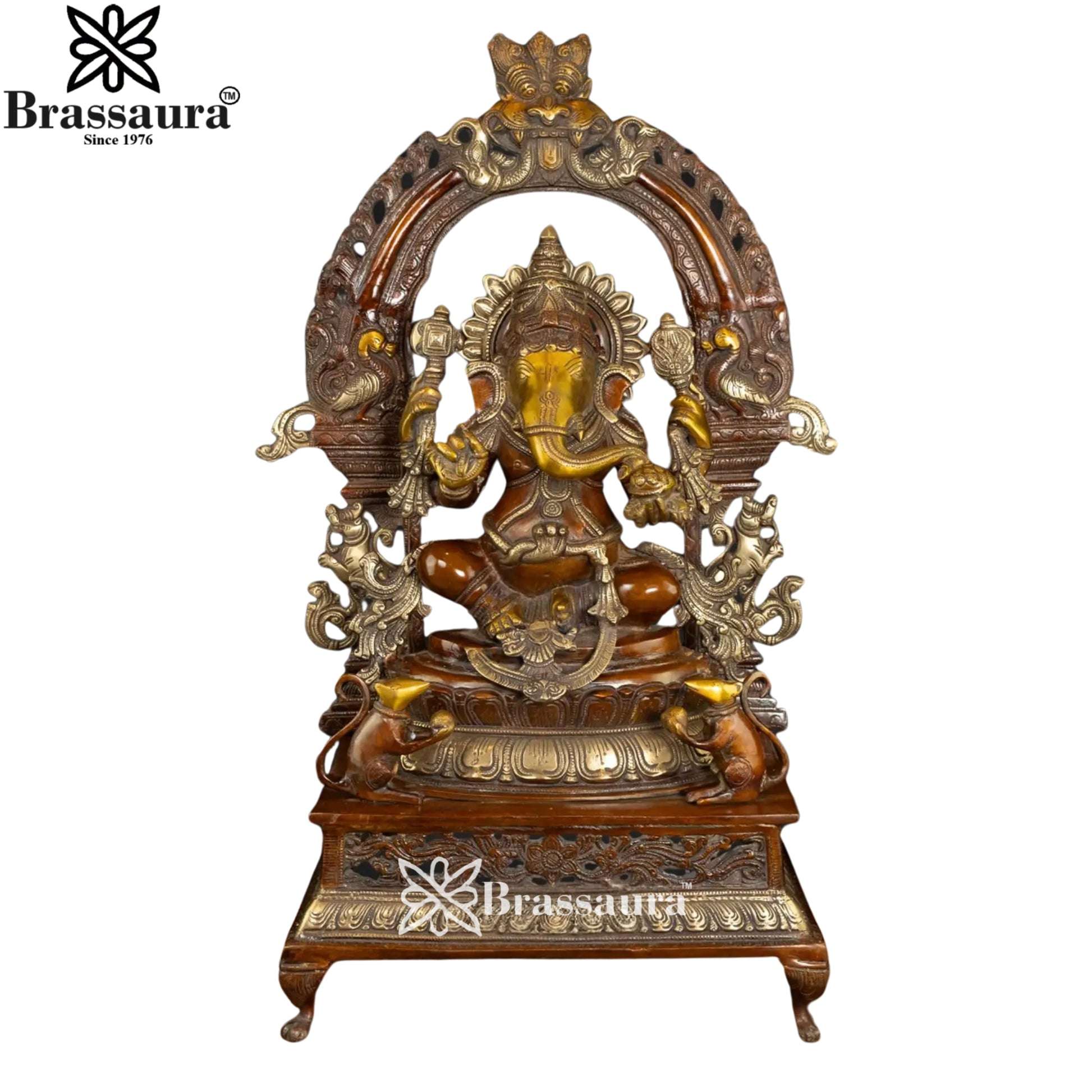 Standing 27.5 inches tall and weighing 25 kg, this stately sculpture features Lord Ganesha framed within a beautifully designed brass ring, representing the unity of the divine and the cyclical nature of life. Handcrafted with intricate detailing and finished with a rich antique patina, this statue is an ideal centerpiece for temples, home altars, or as a prestigious spiritual gift.