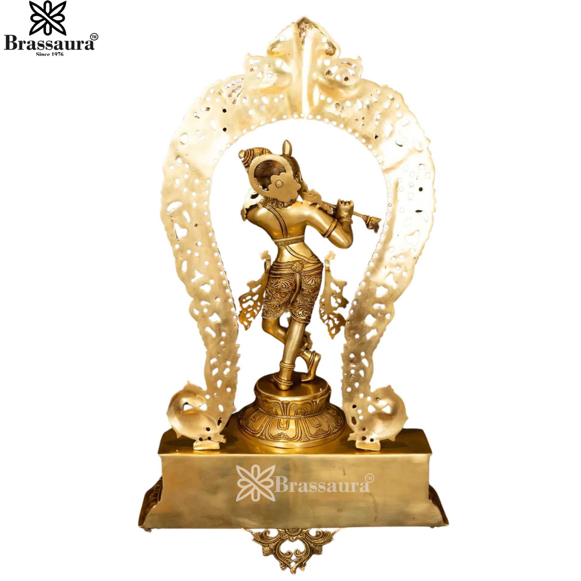 Enhance your spiritual space with this exquisite Brass Royal Gold Krishna Murti. Weighing 20 kg and standing 30.5 inches tall, this finely handcrafted idol embodies the divine grace and charm of Lord Krishna, adorned with a radiant gold finish for a truly majestic look.