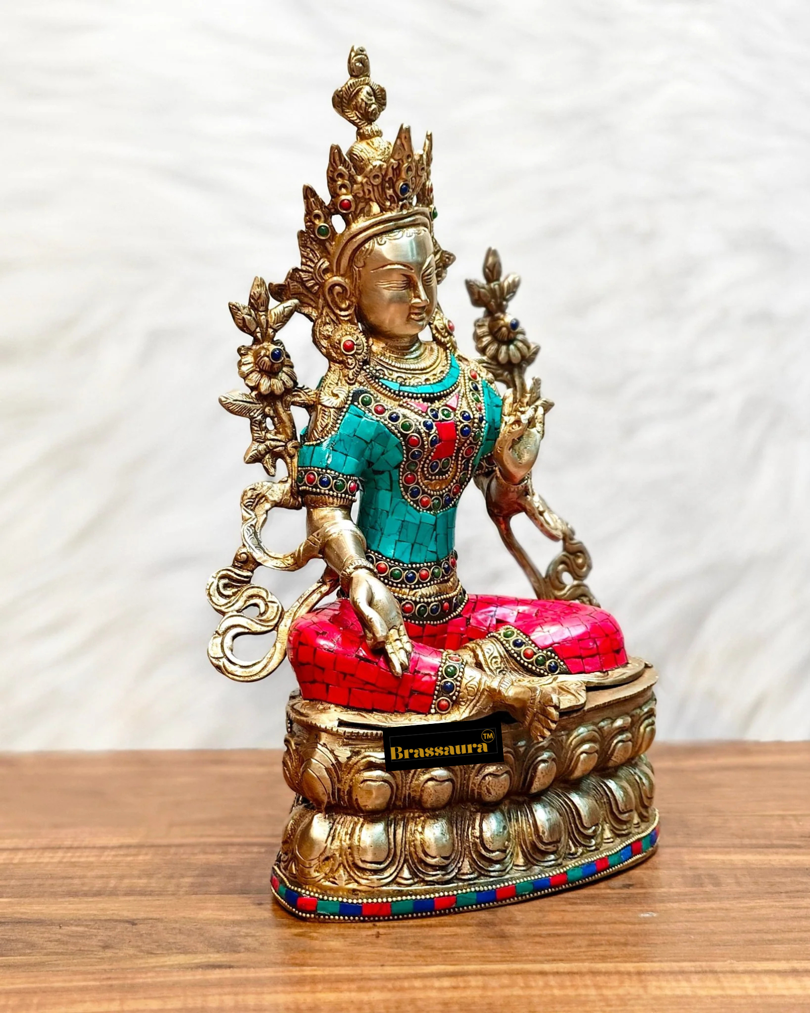 Brassaura™ Pure Brass Green Tara Statue – Height 14 Inches | Weight 5 Kgs | Stonework Detailing