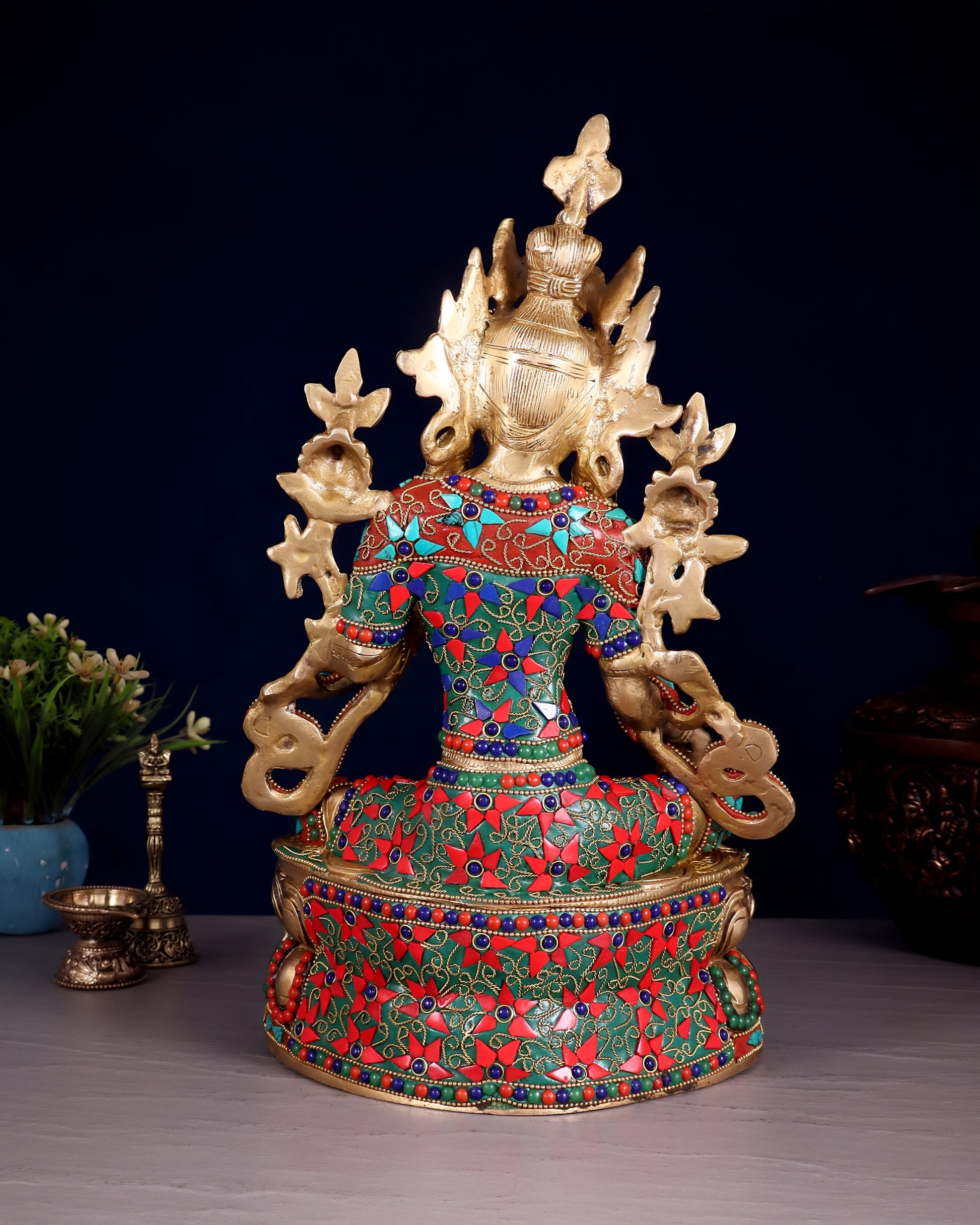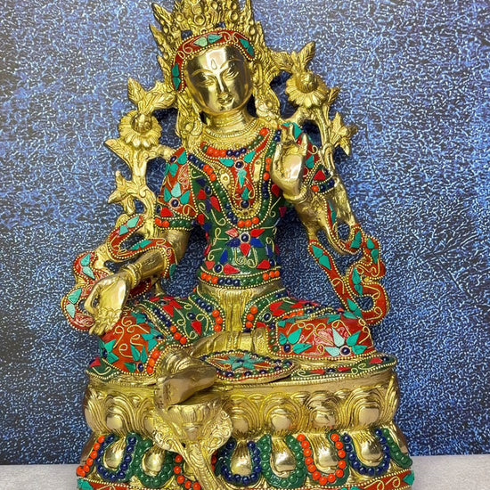 Radiating divine grace and spiritual beauty, this Brass Gemstone Tara Statue stands 14 inches tall and weighs 4.8 kg. Crafted from solid brass and adorned with vibrant gemstone inlay, this piece captures the serene yet powerful essence of Goddess Tara, the embodiment of compassion and enlightened wisdom.
