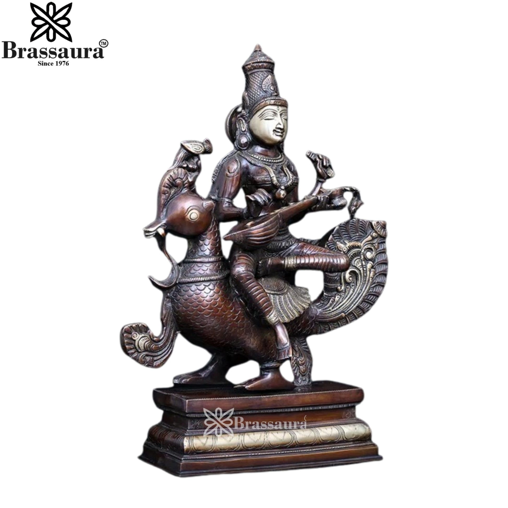 Brassaura™ Artistic Brass Saraswati Idol – Height 19 Inches & Weight 14.2 Kgs | Puja & Temple Décor