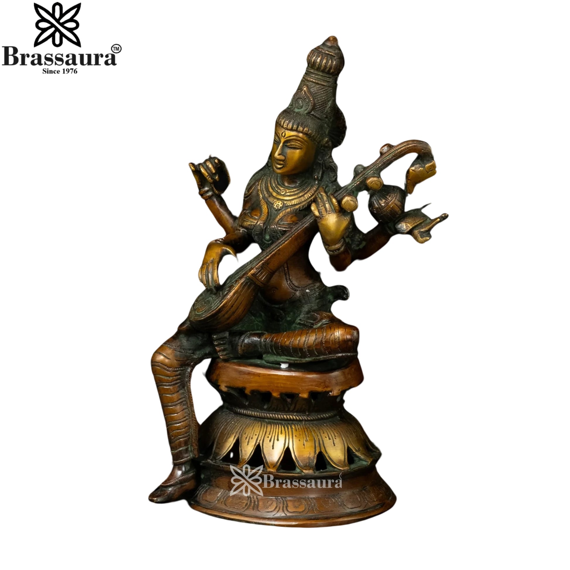Brassaura™ Brass Saraswati Figurine – Height 12.2 Inches & Weight 4.59 Kgs | Artistic Goddess Statue
