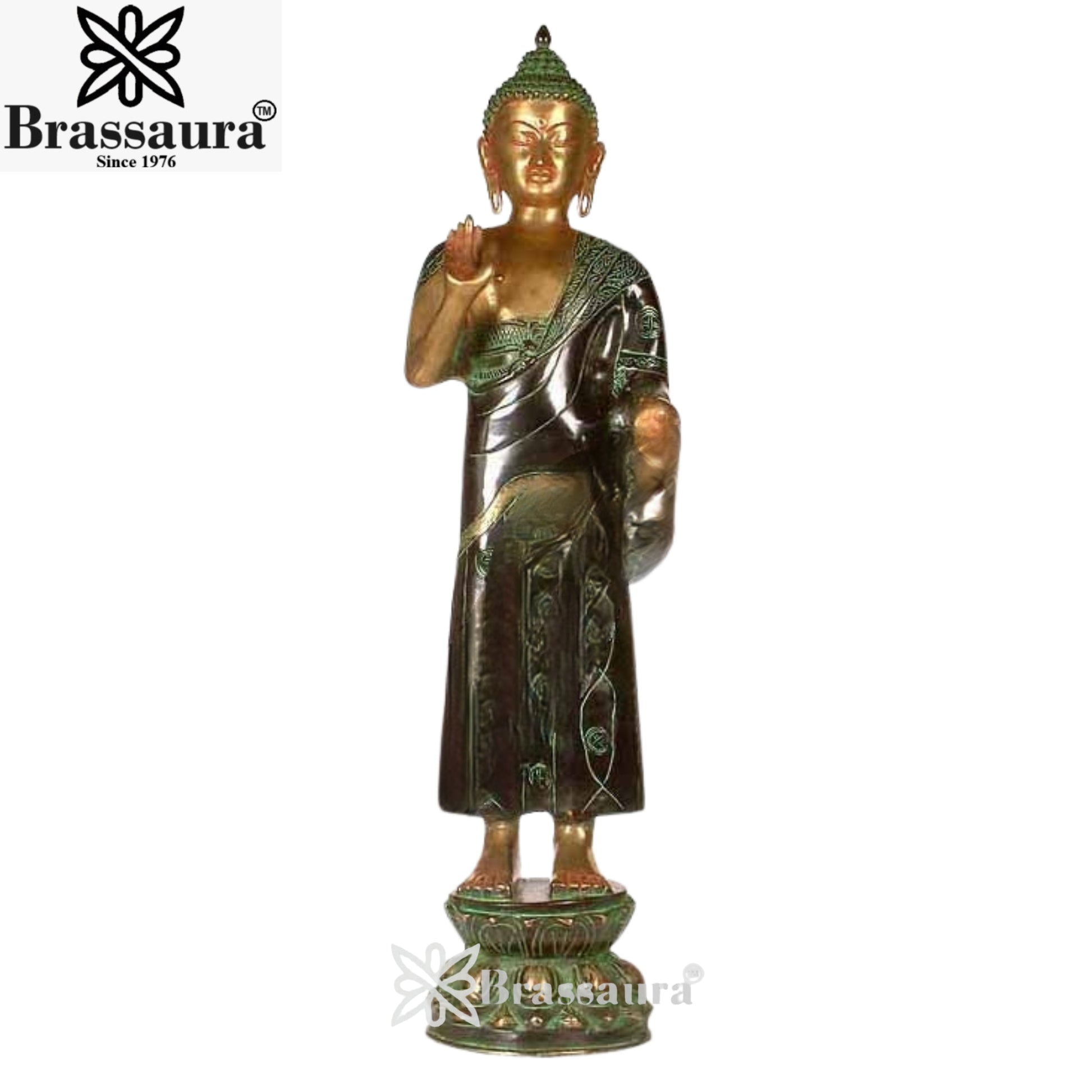 all, elegant, and spiritually uplifting, this Brass Standing Buddha stands 33 inches high and weighs 13 kg. Crafted from solid brass with fine detailing, the statue depicts the Buddha in a poised standing posture—symbolizing protection, blessing, and spiritual presence.