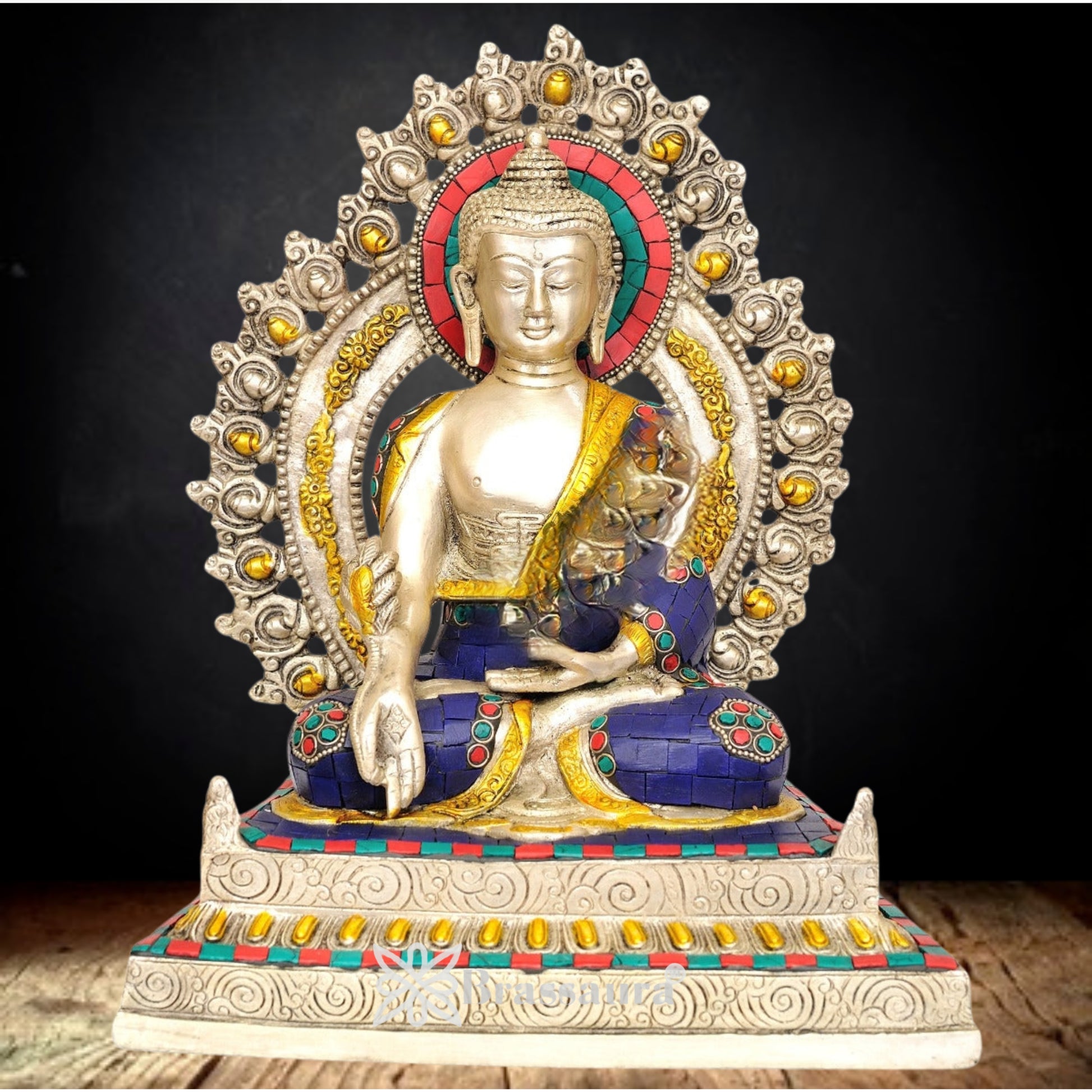 Small in size yet rich in spiritual presence, this Brass Bhumisparsha Buddha with Gemstone Work is a refined expression of enlightenment and sacred artistry. Standing 11 Inch tall and weighing 6 kg, it is expertly handcrafted from solid brass and adorned with intricate gemstone inlays that bring color and depth to the piece.