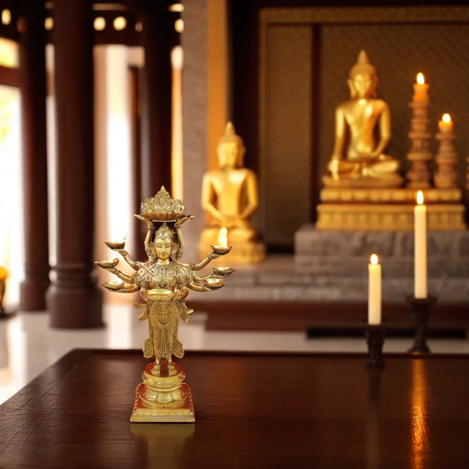 Graceful and divine, this Brass Standing Lady Diya captures the timeless beauty of a traditional Indian woman holding an oil lamp — symbolizing light, devotion, and cultural heritage. With its intricate craftsmanship and golden brass finish, this statue adds a regal and spiritual presence to pooja rooms, entrances, or festive spaces.