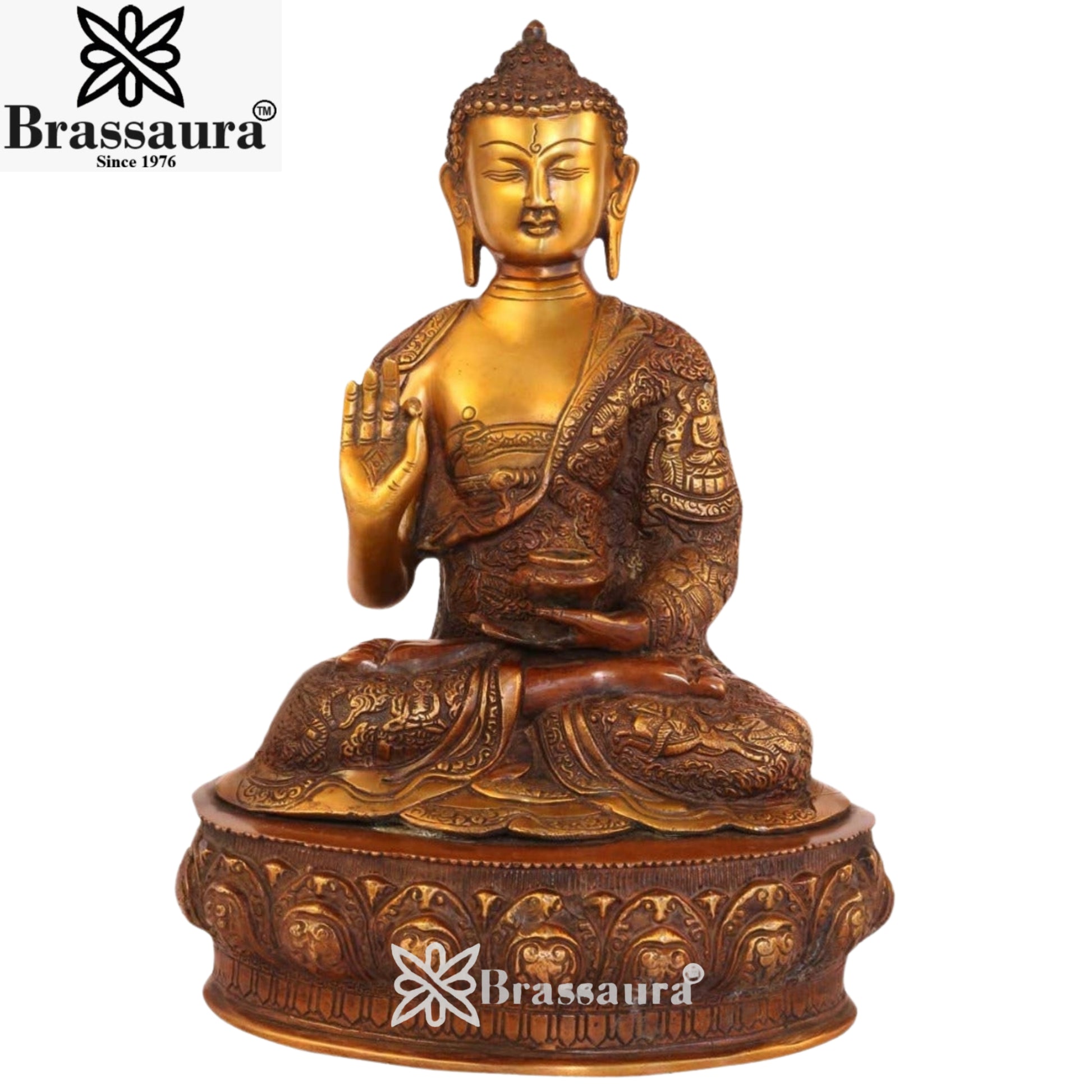 nfuse your space with timeless spirituality and artistic depth with this Brass Vintage Buddha. Standing 14 inches tall and weighing 7.3 kg, this statue is handcrafted from solid brass and finished with a beautifully aged vintage patina, offering both visual richness and spiritual significance.