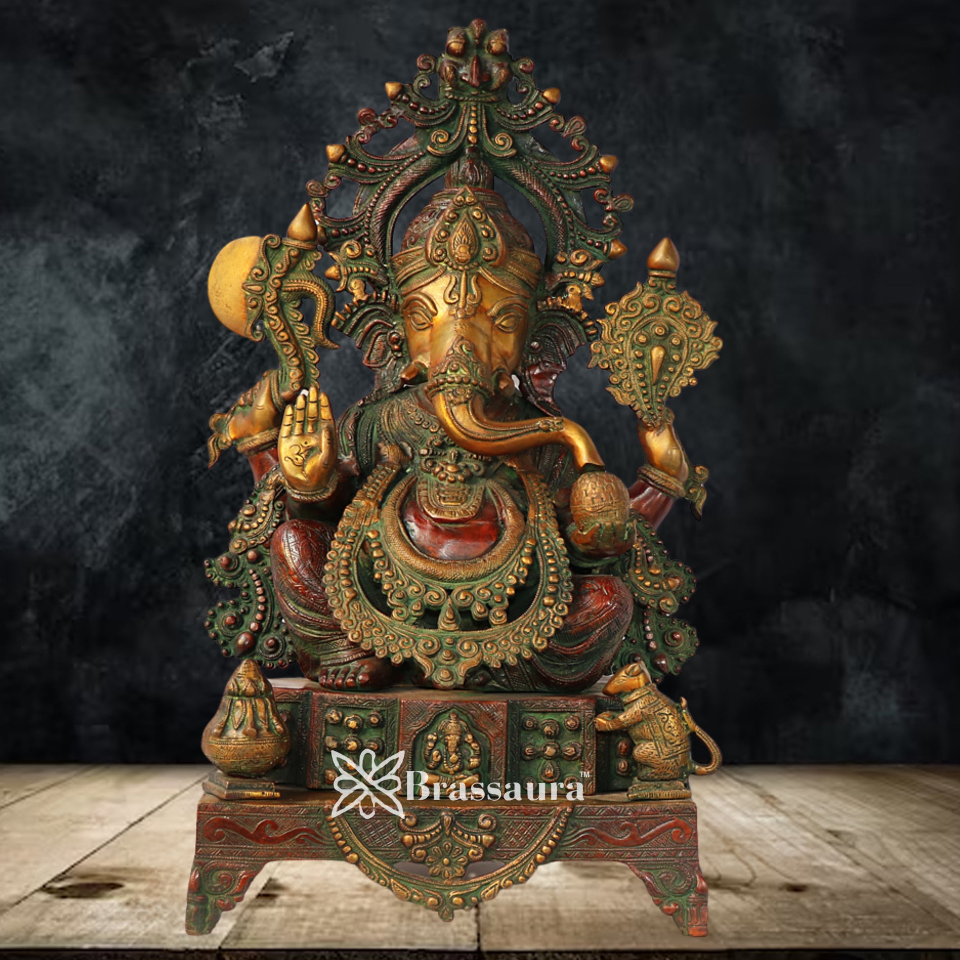 Standing an impressive 27 inches tall and weighing 37 kg, this masterpiece showcases Lord Ganesha in a grand traditional form, enriched with vintage-style detailing that speaks to India’s rich spiritual heritage. Expertly handcrafted from solid brass and finished with a deep antique patina, it is ideal for temples, spacious interiors, or as a heritage centerpiece that radiates blessings and cultural depth.