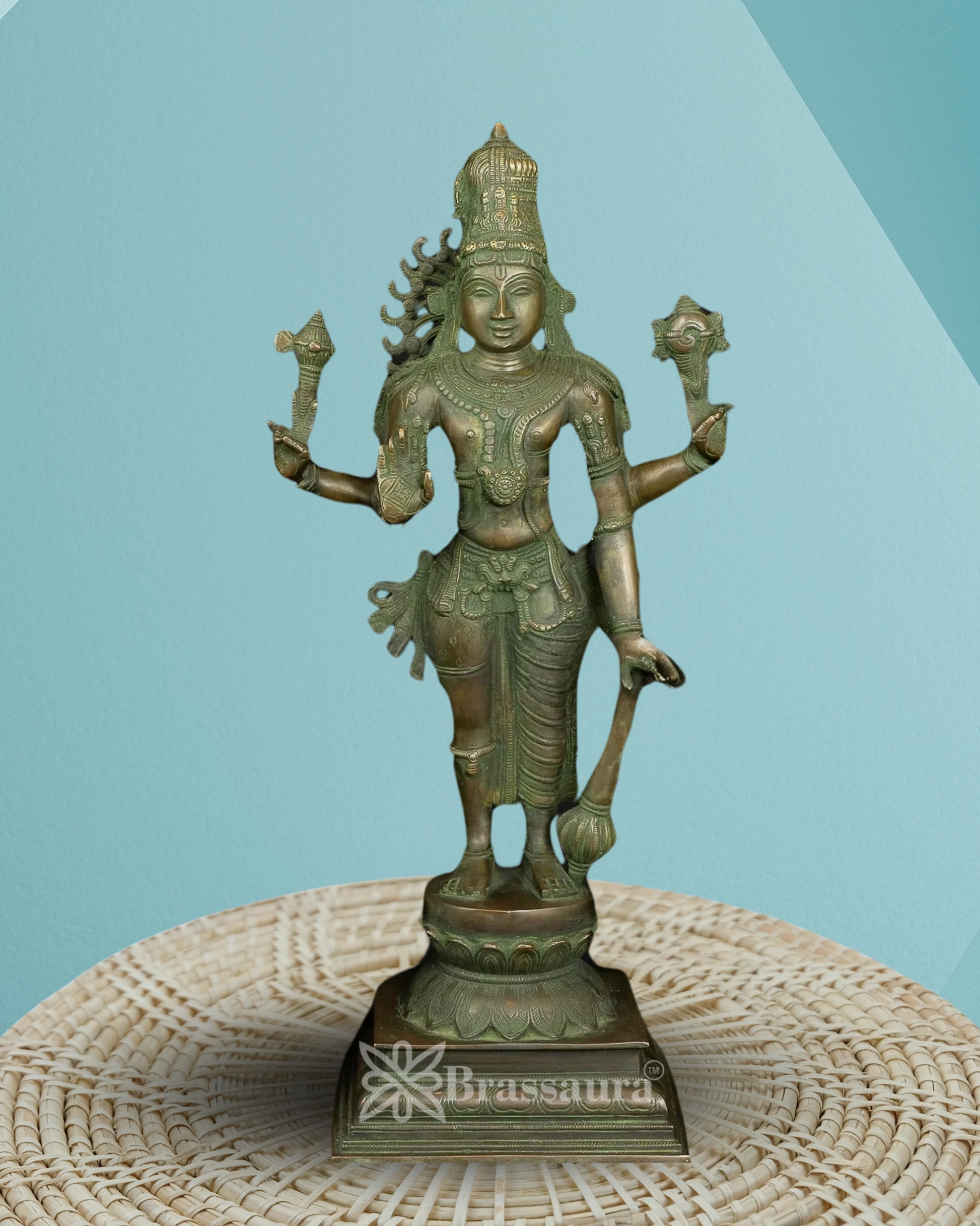 Expertly handcrafted from solid brass, this idol features intricate detailing—from the traditional attire to the sacred symbols—radiating spiritual energy and timeless beauty. Finished with a rich antique polish, it is perfect for pooja rooms, home temples, or sacred gifting.