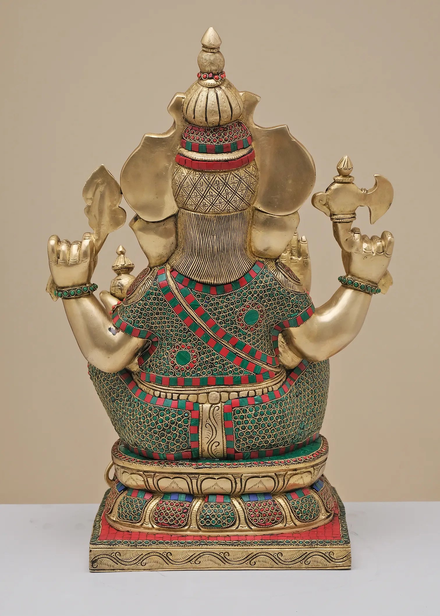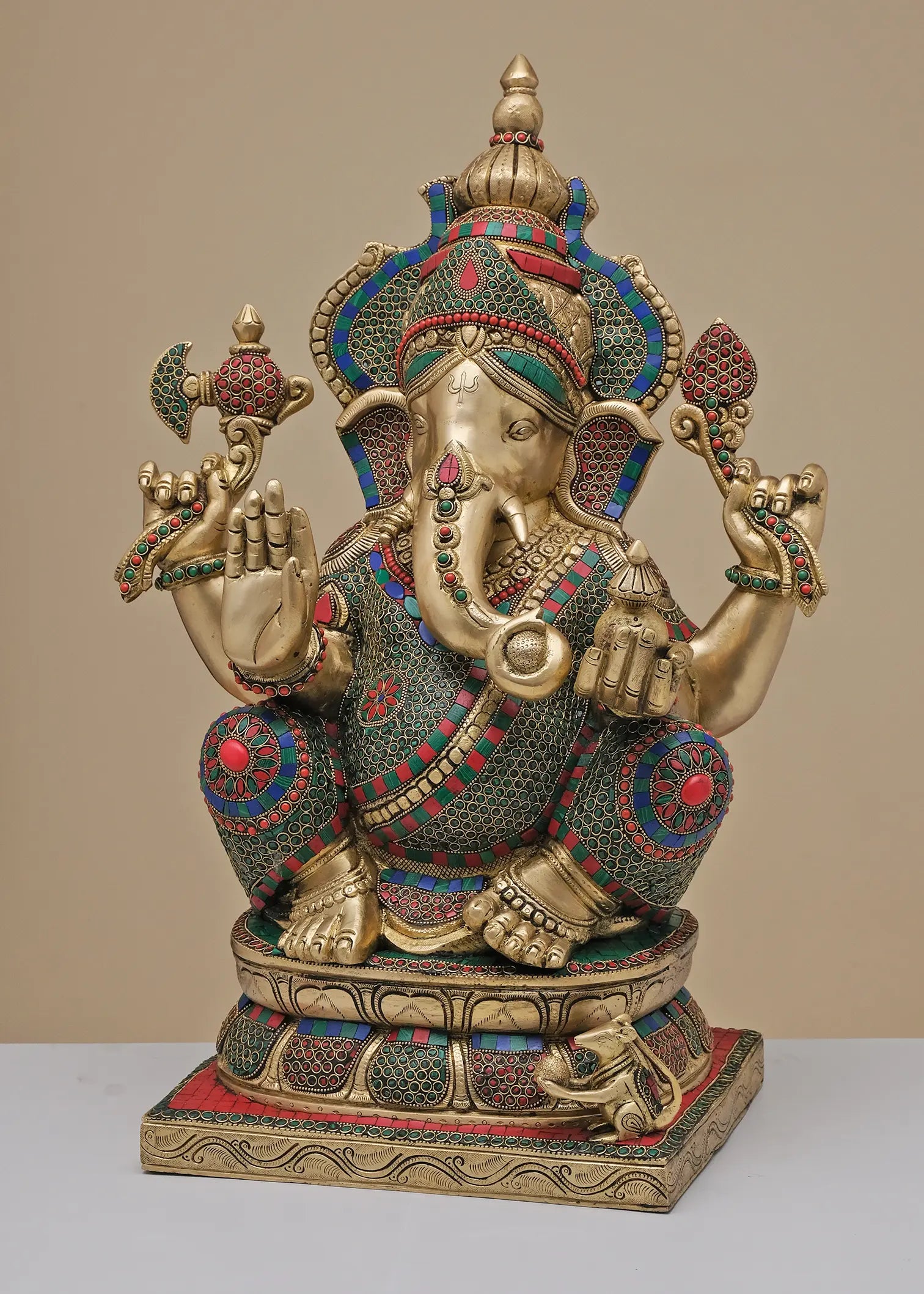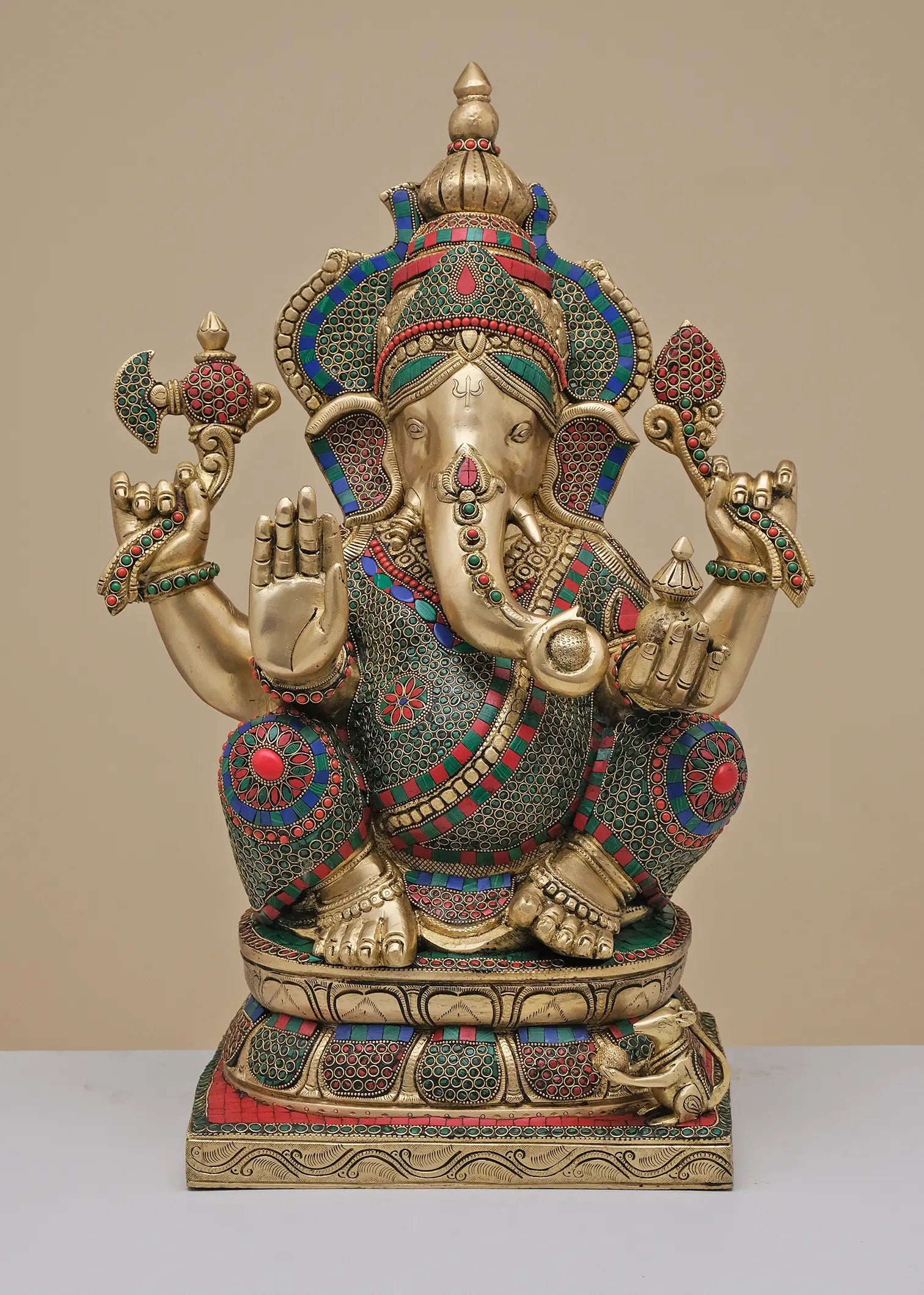 Expertly handcrafted, this grand seated Ganesha idol showcases intricate multicolor inlay artistry across the crown, ornaments, attire, and pedestal. The detailed carving combined with vibrant stonework enhances the divine expression and majestic presence of Lord Ganesha. Designed as a powerful spiritual focal point, this masterpiece brings prosperity, protection, and timeless elegance to temples and refined interiors.