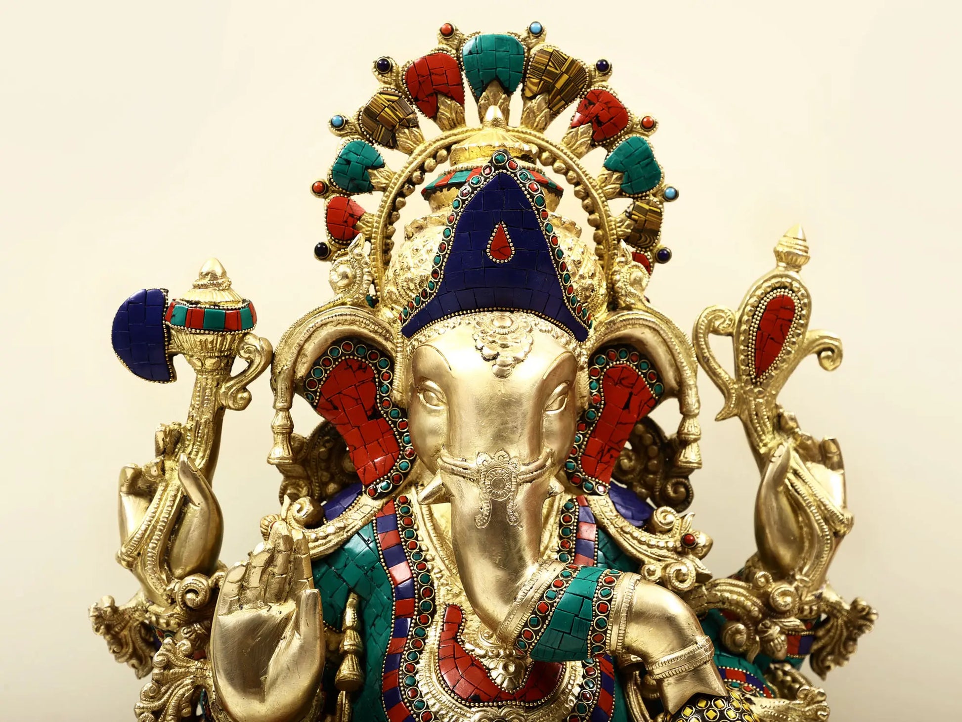 This majestic seated Lord Ganesha idol showcases exquisite meenakari stonework in vibrant red, turquoise, and deep blue hues, beautifully accentuating the rich brass form. Adorned with an ornate crown, detailed halo, and intricately carved throne base, the idol radiates divine grace and regal presence. Every element—from the symbolic attributes in each hand to the finely embellished pedestal—reflects exceptional craftsmanship, making it a grand spiritual centerpiece for temples and luxury interiors.