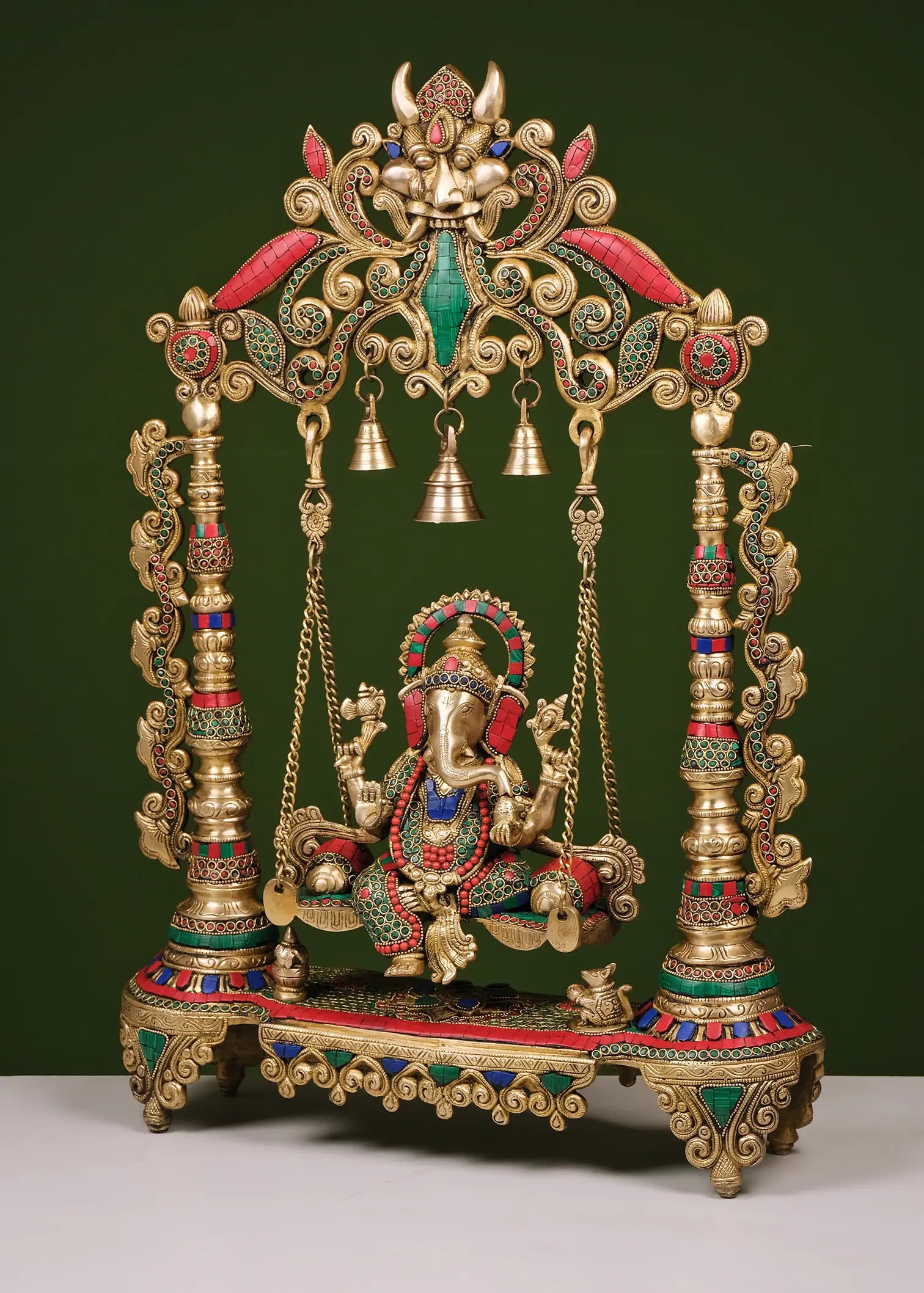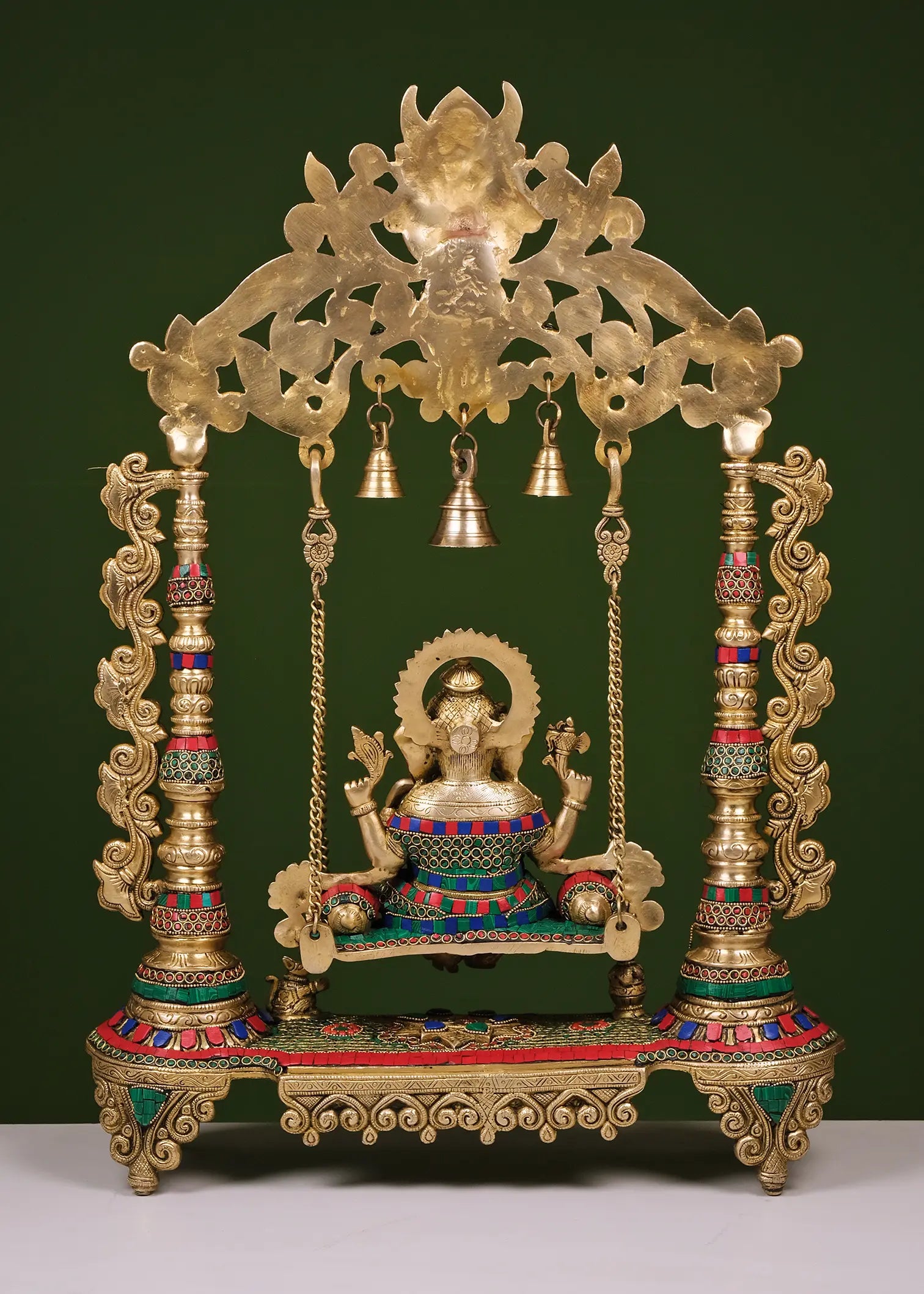 Exquisitely crafted with intricate detailing and vibrant inlay embellishments, this majestic Jhula Ganesha features the divine seated on a beautifully decorated swing beneath an ornate arch crowned with traditional motifs and hanging bells. The rich color accents and elaborate carvings enhance its regal presence, making it a magnificent spiritual centerpiece for grand interiors and temple spaces.