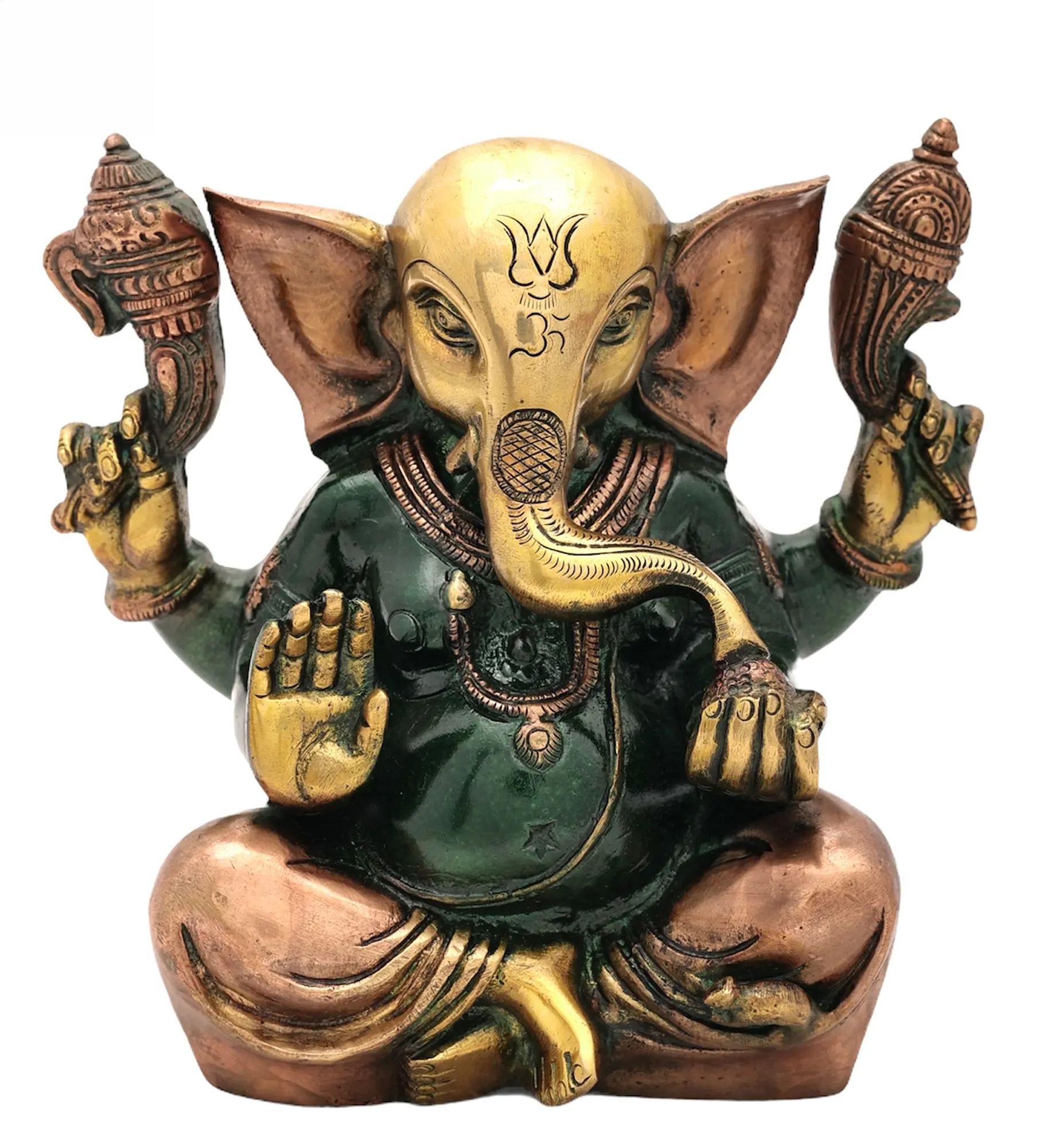 This compact and artistically crafted Seated Ganesha idol features a beautiful dual-tone finish with deep green and antique brass highlights. Lord Ganesha is shown in a traditional blessing posture, holding sacred attributes and a modak, symbolizing wisdom and abundance. The expressive detailing and rich finish make this piece ideal for personal altars, work desks, and thoughtful gifting.