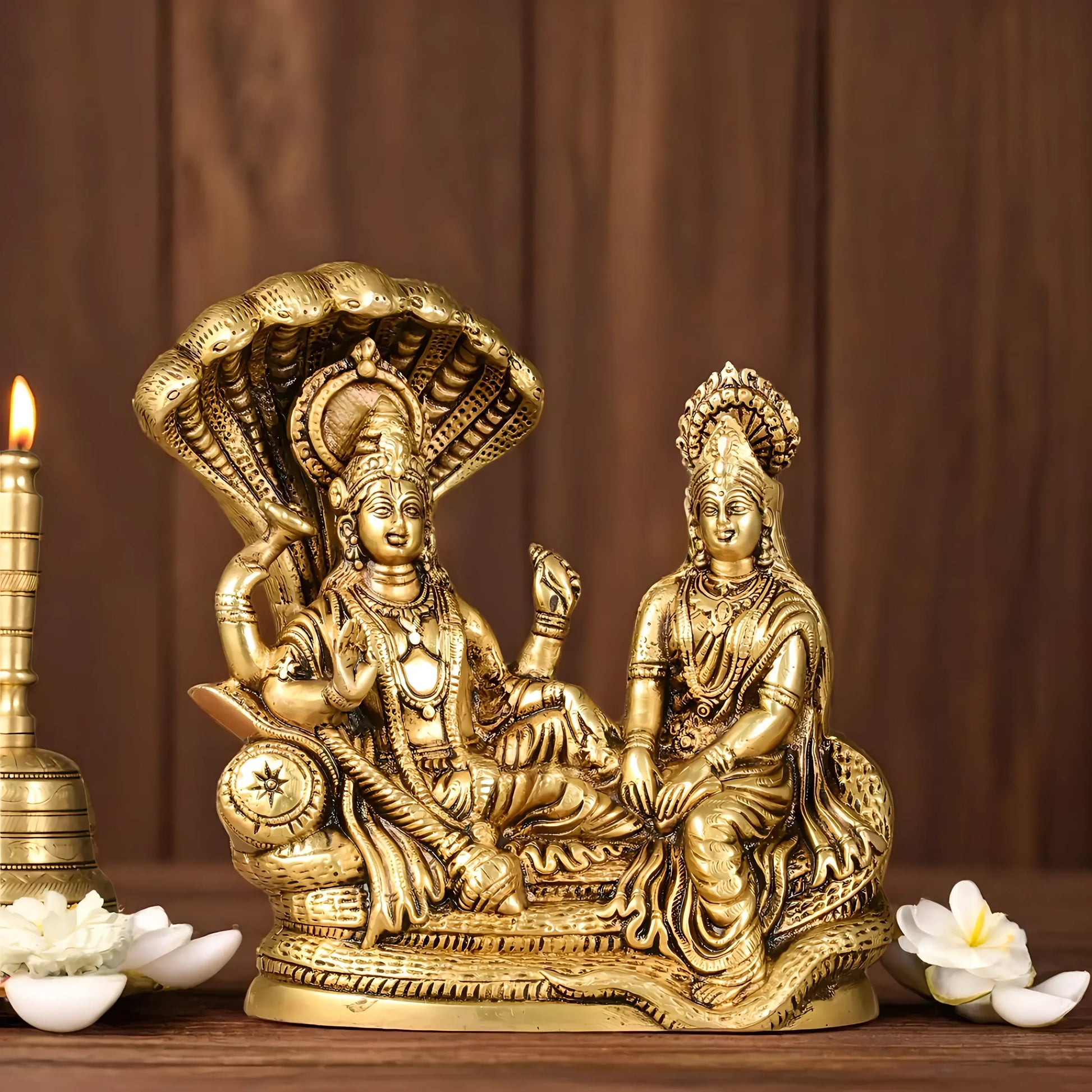 Brassaura™ Pure Brass Lakshmi Narayan Idol on Sheshnaag – 4kg, 8-Inch – Handcrafted Idol for Serenity & Prosperity in Home Temple