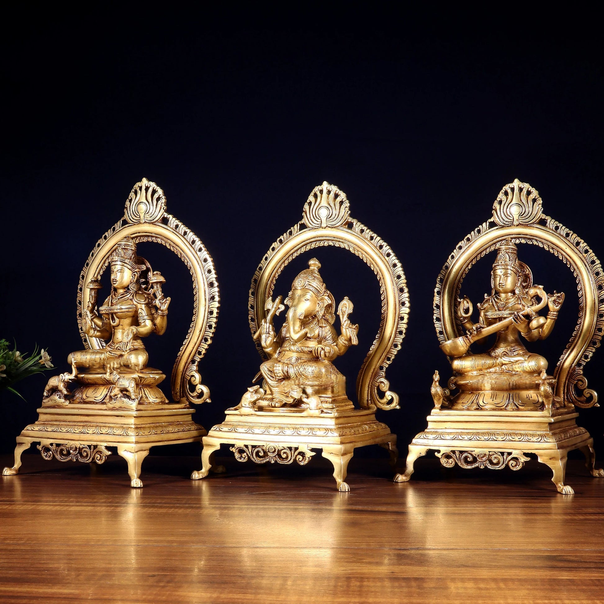 Experience divine harmony with this exquisite trio of Lord Ganesha, Goddess Lakshmi, and Goddess Saraswati—each seated beneath an intricately carved Prabhavali frame. Handcrafted in pure solid brass with traditional detailing, this set symbolizes wisdom, prosperity, and knowledge. A perfect addition for home temples, festive décor, or auspicious gifting.