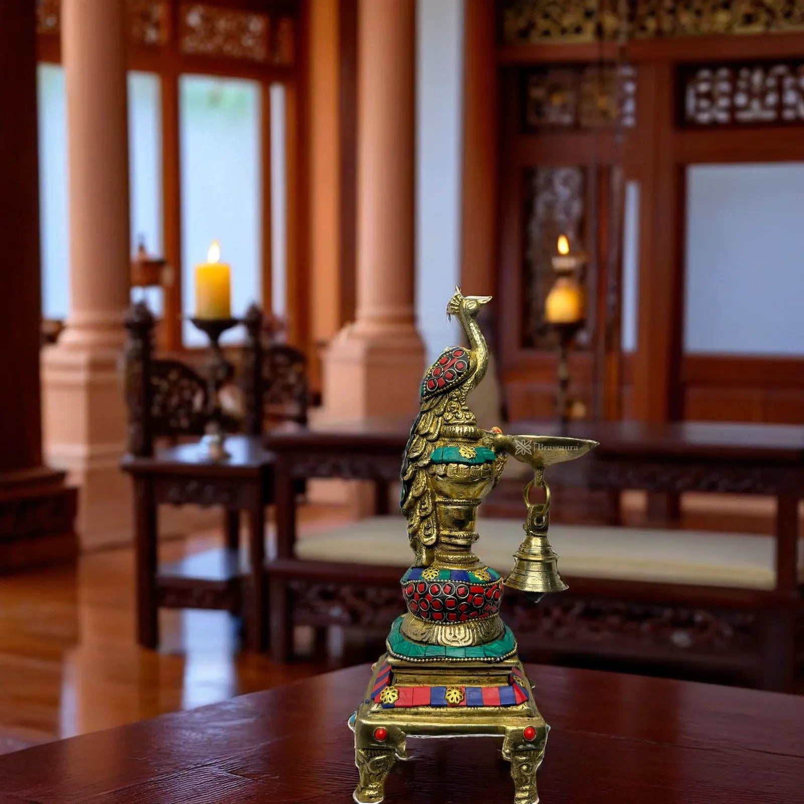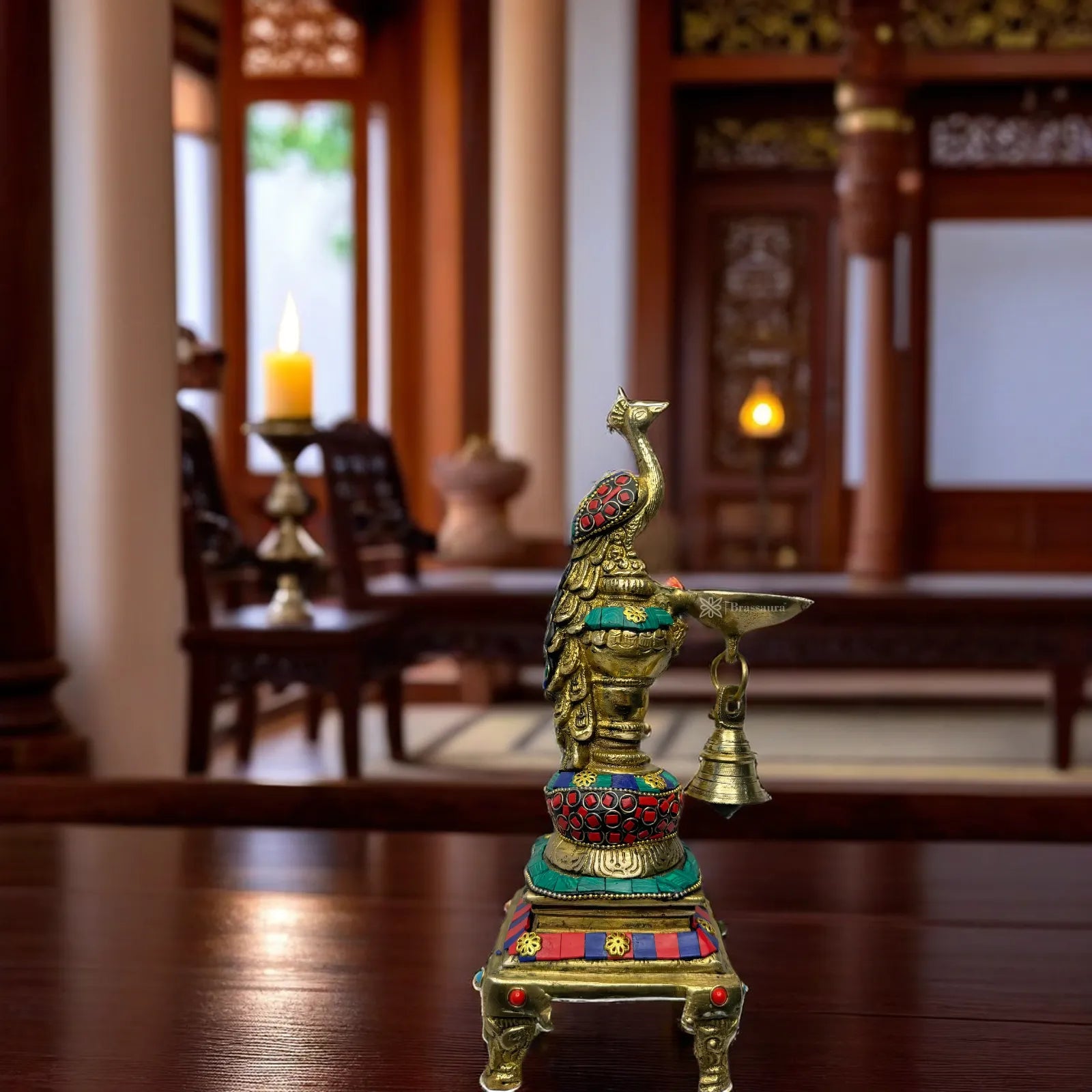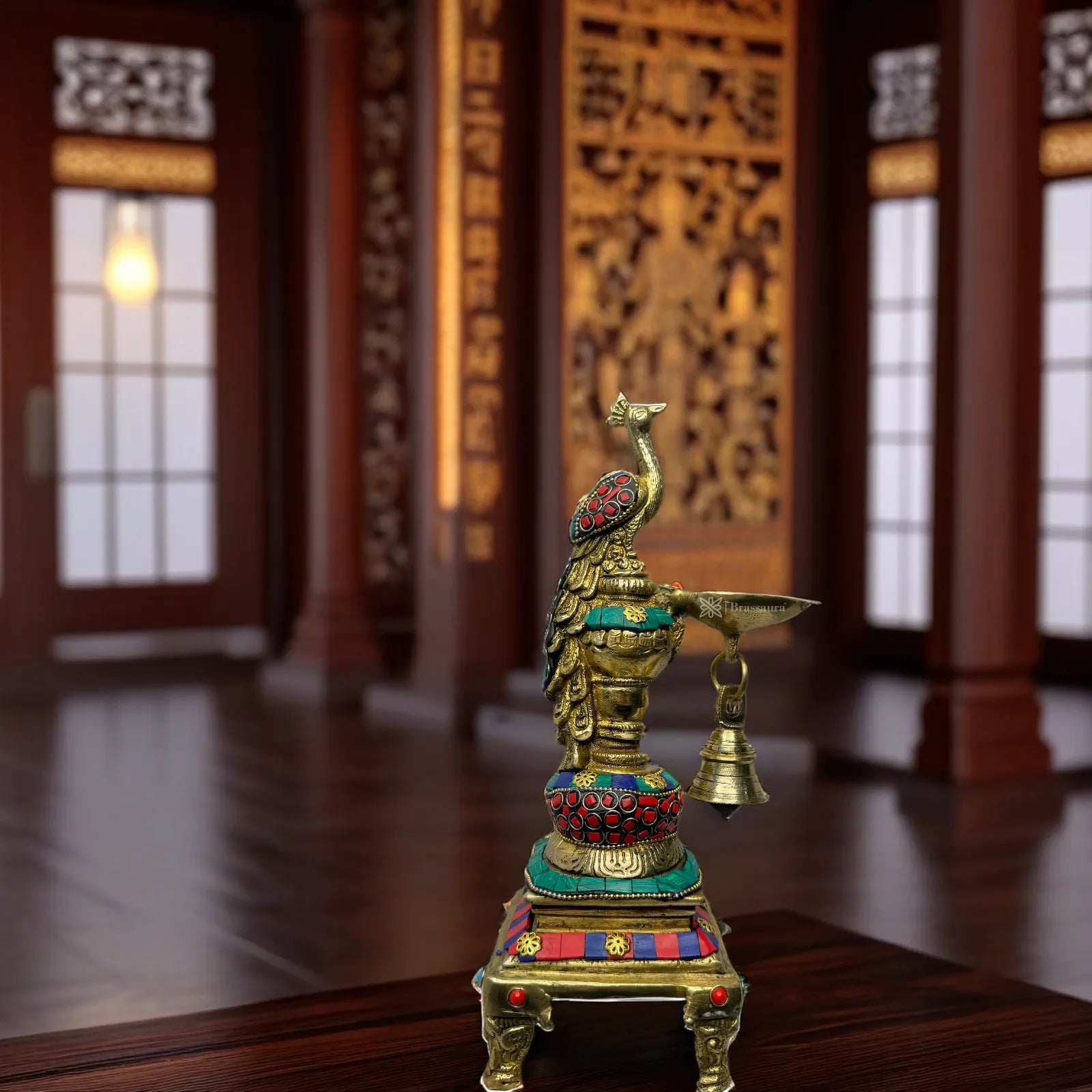 Brass Gem Stone Work Peacock Diya for Home Decor Weight 2 Kg Height 7.9 Inch