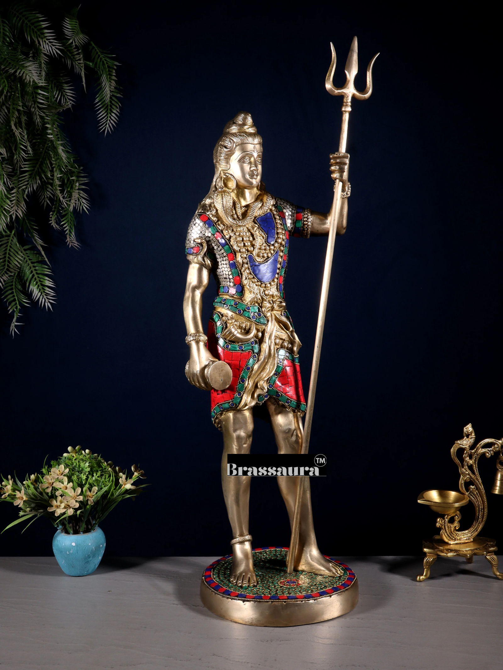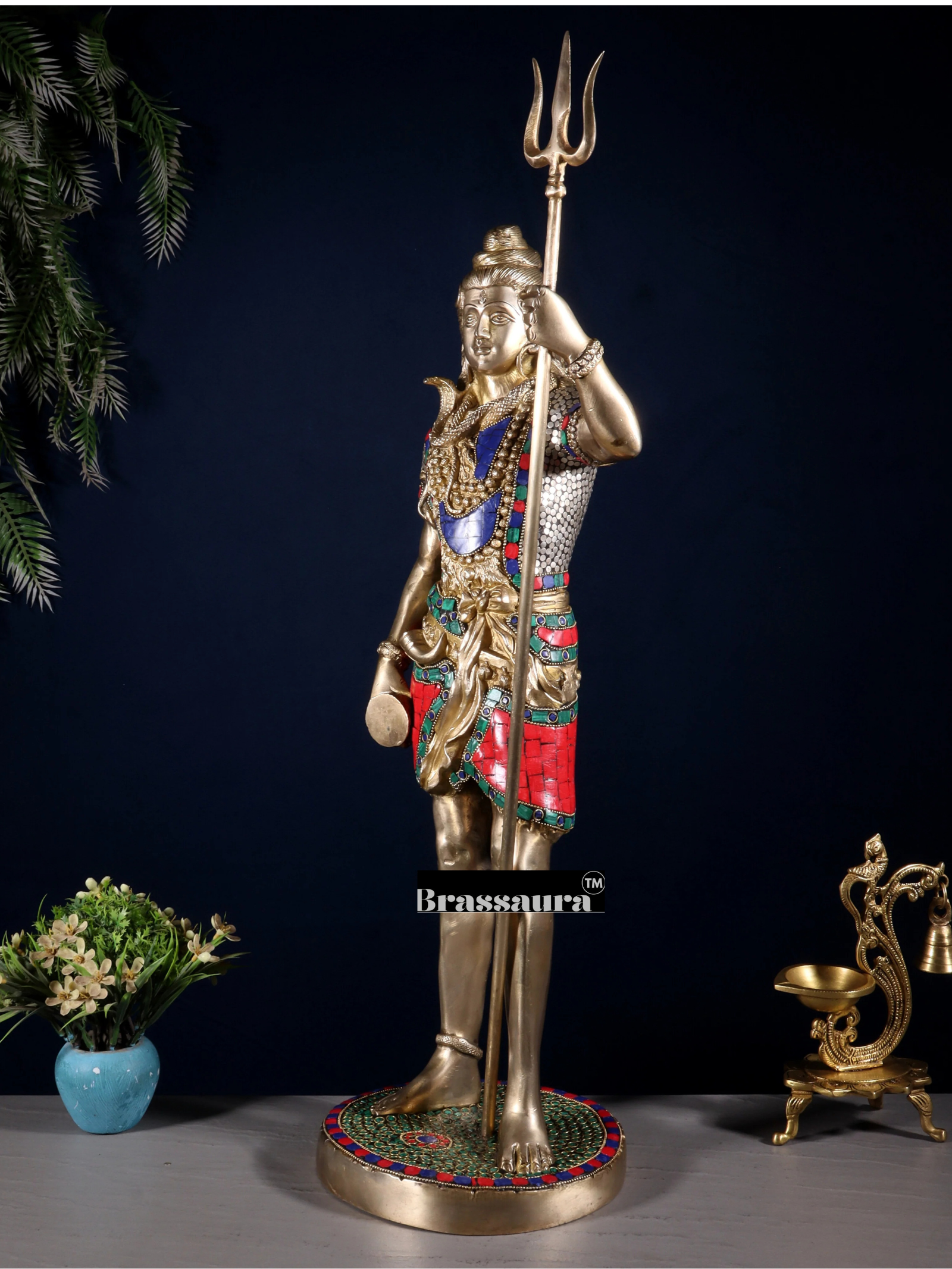 Brassaura™ Brass Gem Stone Work Standing Shiva Idol – Height 23 Inches & Weight 10.5 Kgs | Spiritual Home Décor