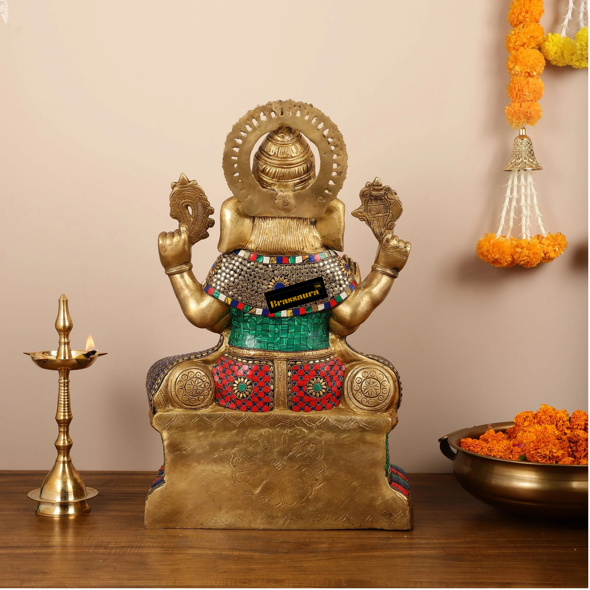 Brassaura™ Brass Lord Ganapati Statue with Intricate Stonework – Height 24 Inches, Weight 26 Kgs