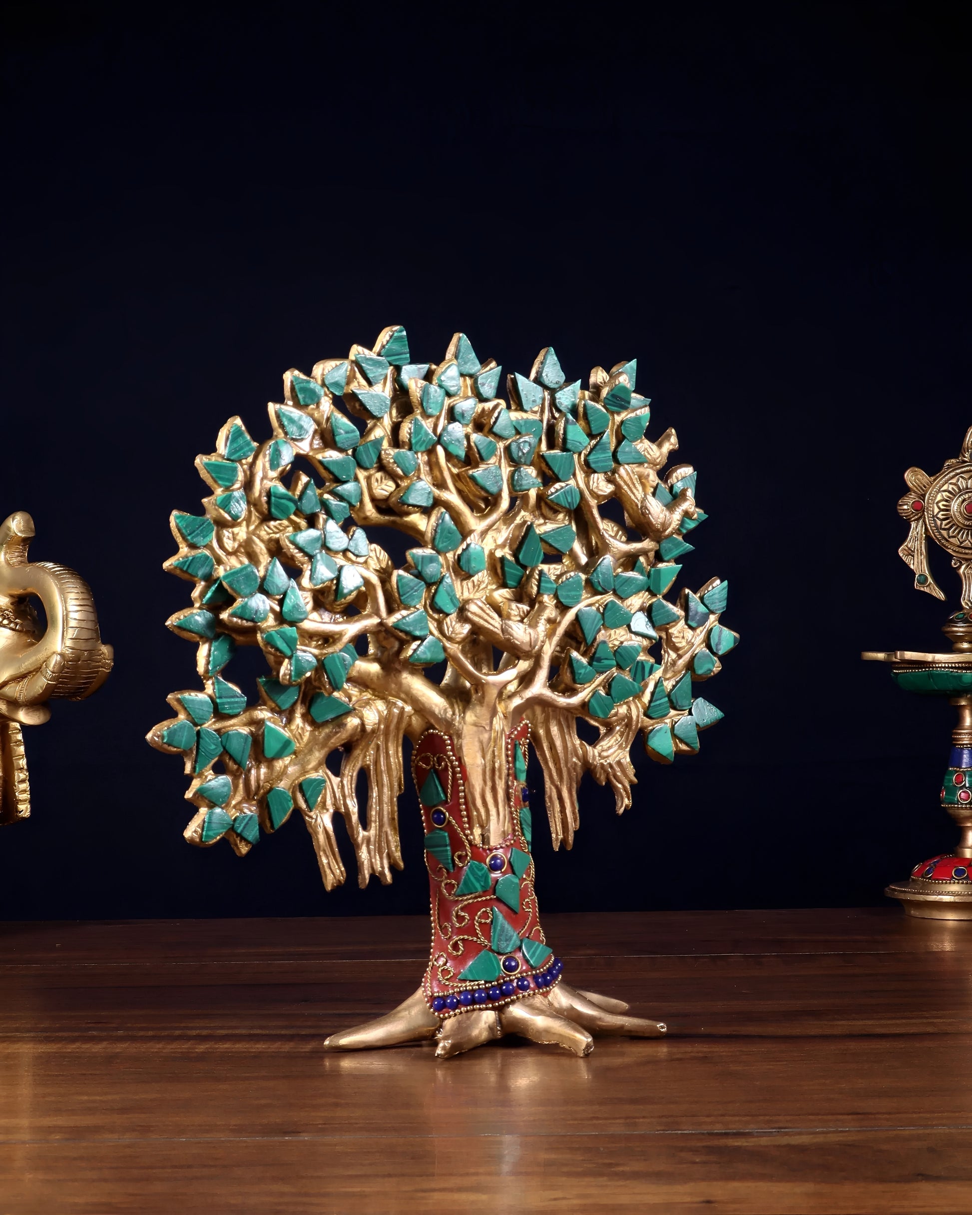 Add a touch of enchantment to your space with this Pure Brass Handcrafted Kalpavriksha Tree with intricate stonework. Standing 9.5 inches tall and 8.5 inches wide, and weighing 1.2 kgs, this exquisite table-standing sculpture makes a stunning centerpiece for your tabletop or shelf. It embodies traditional Indian craftsmanship while bringing serenity, beauty, and positive energy into your home décor.