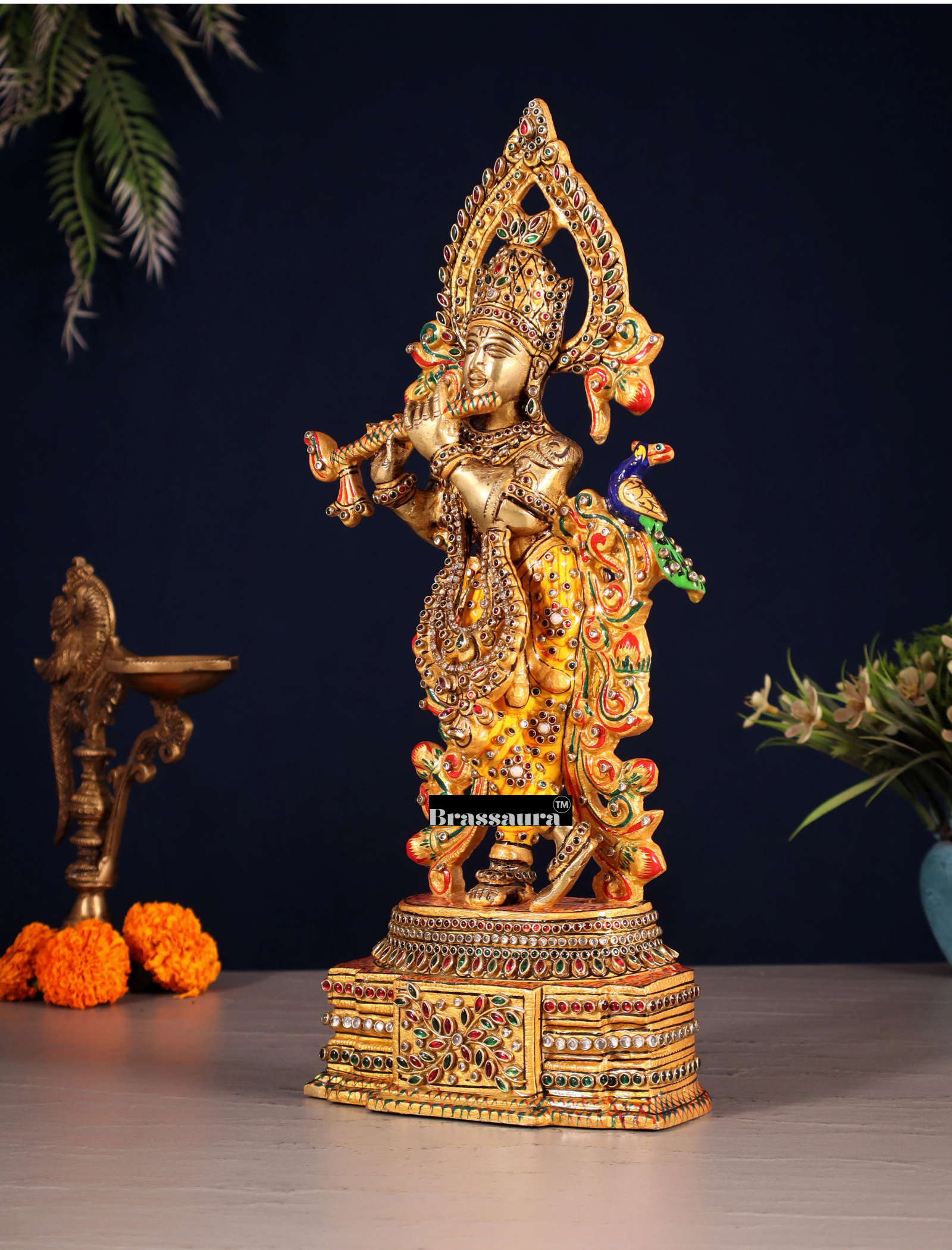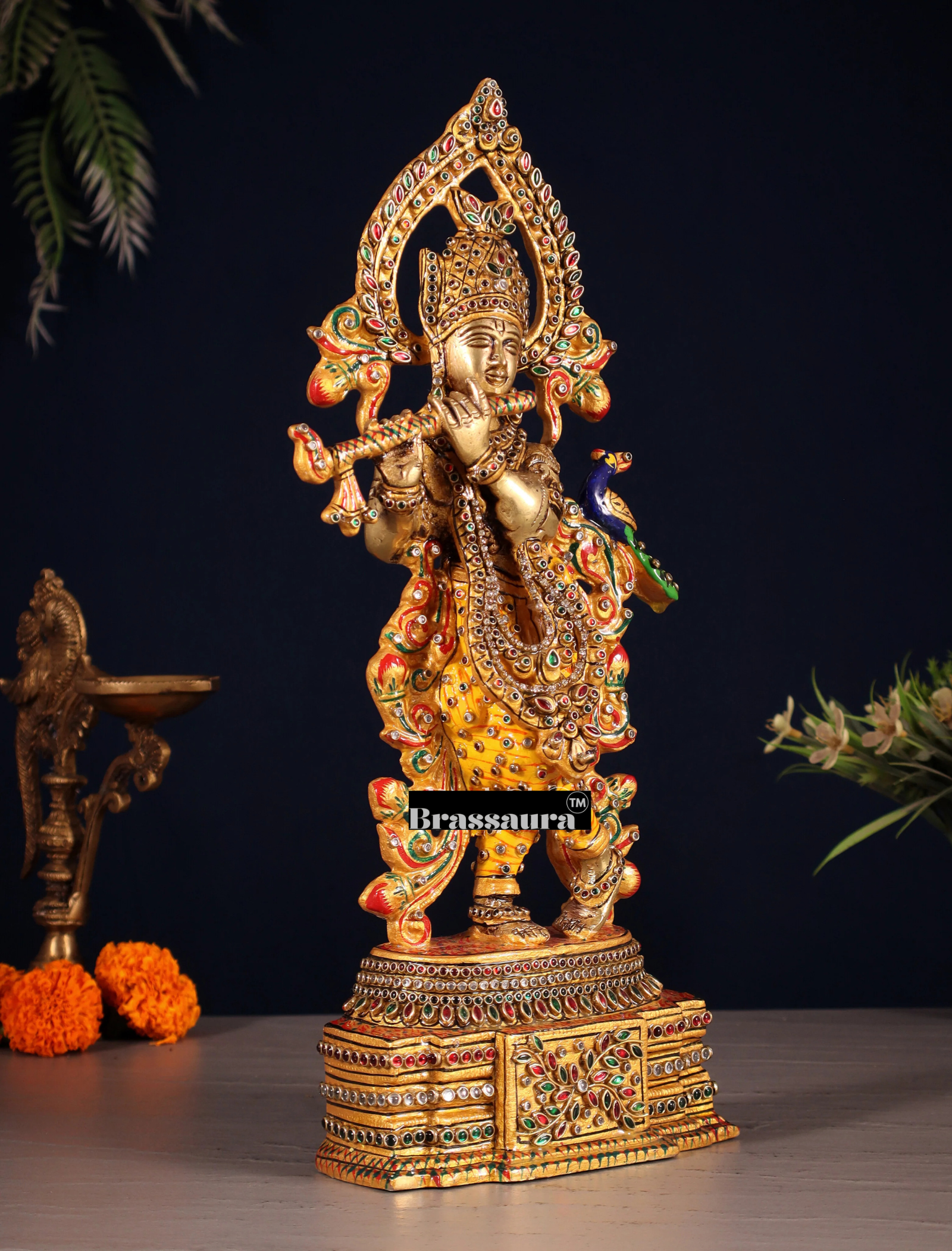 BrassAura™ Pure Brass Lord Krishna Statue – Laakh Meenakari Work | Height 13.5 Inch | Weight 3.3 Kg