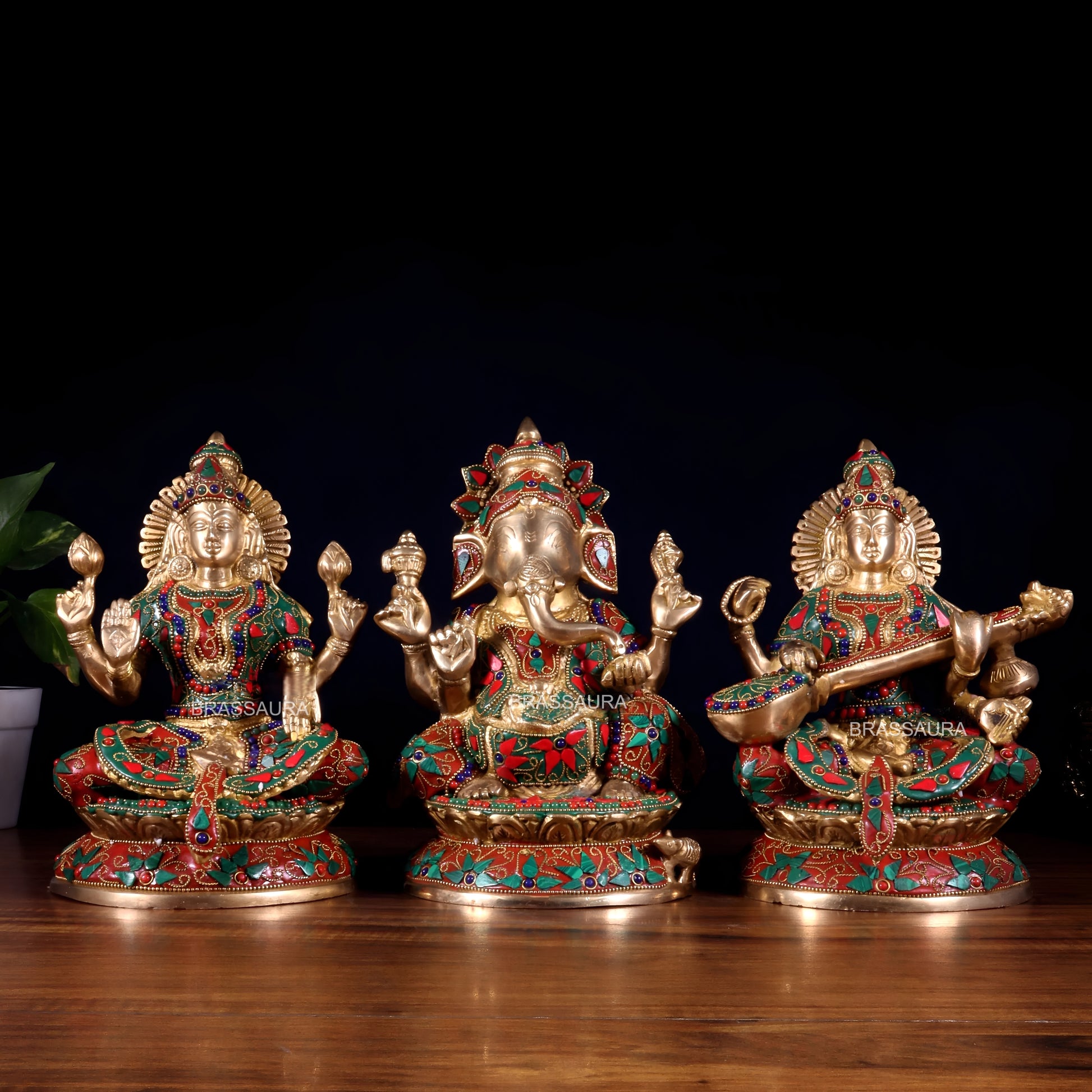 Brassaura™ Brass Lakshmi Ganesha Saraswati Idol Set | Height 9.5 Inches & Total Weight 9.9 Kgs