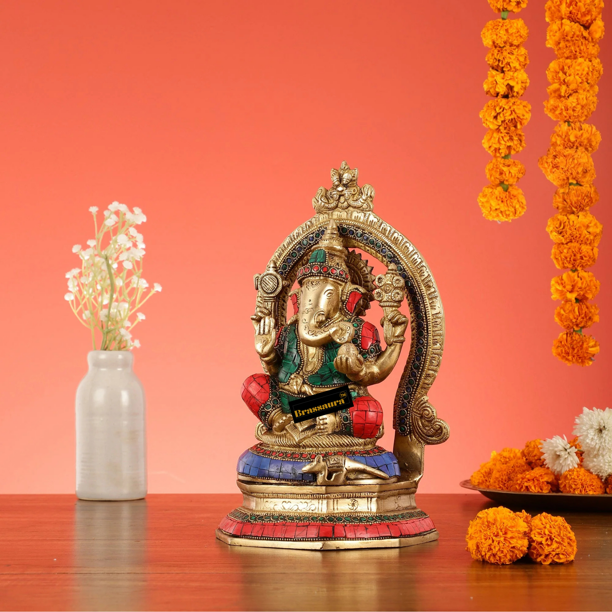 Brassaura™ Brass Lord Ganesha Murti with Stonework – Height 11.5 Inches, Weight 4 Kgs