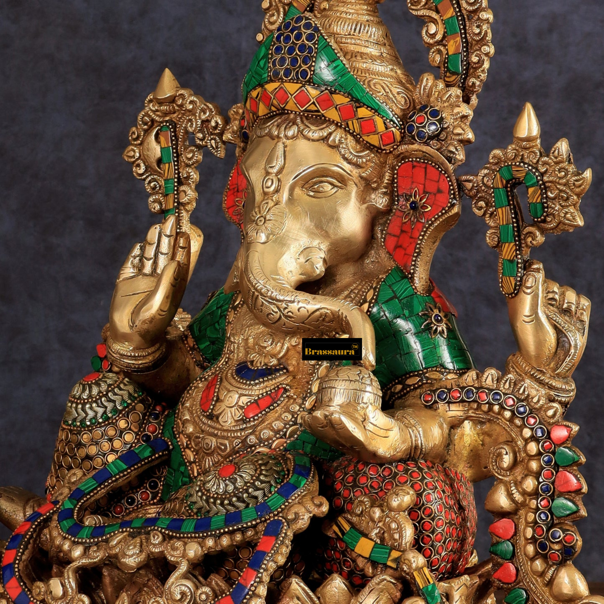 Brassaura™ Fine Quality Brass Jewellery Ganesha – 16" Height, 16 kg – Adorned with Natural Stones & Rings