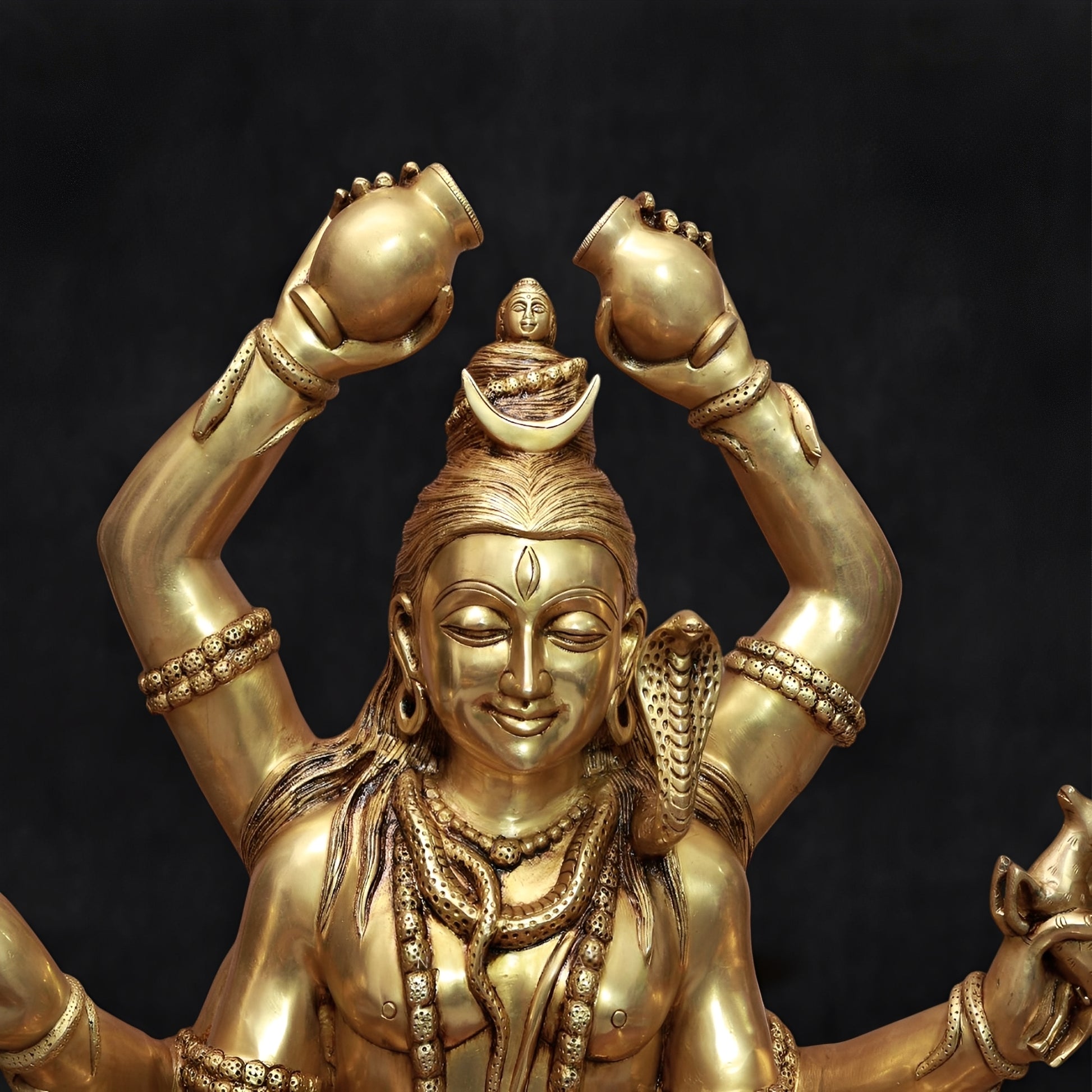 This Brass Lord Mrityunjaya Shiva Statue is a grand, intricately handcrafted piece symbolizing protection, strength, and spiritual power. Perfect for temples, home mandirs, or as a majestic centerpiece, it brings divine energy and reverence to any space.