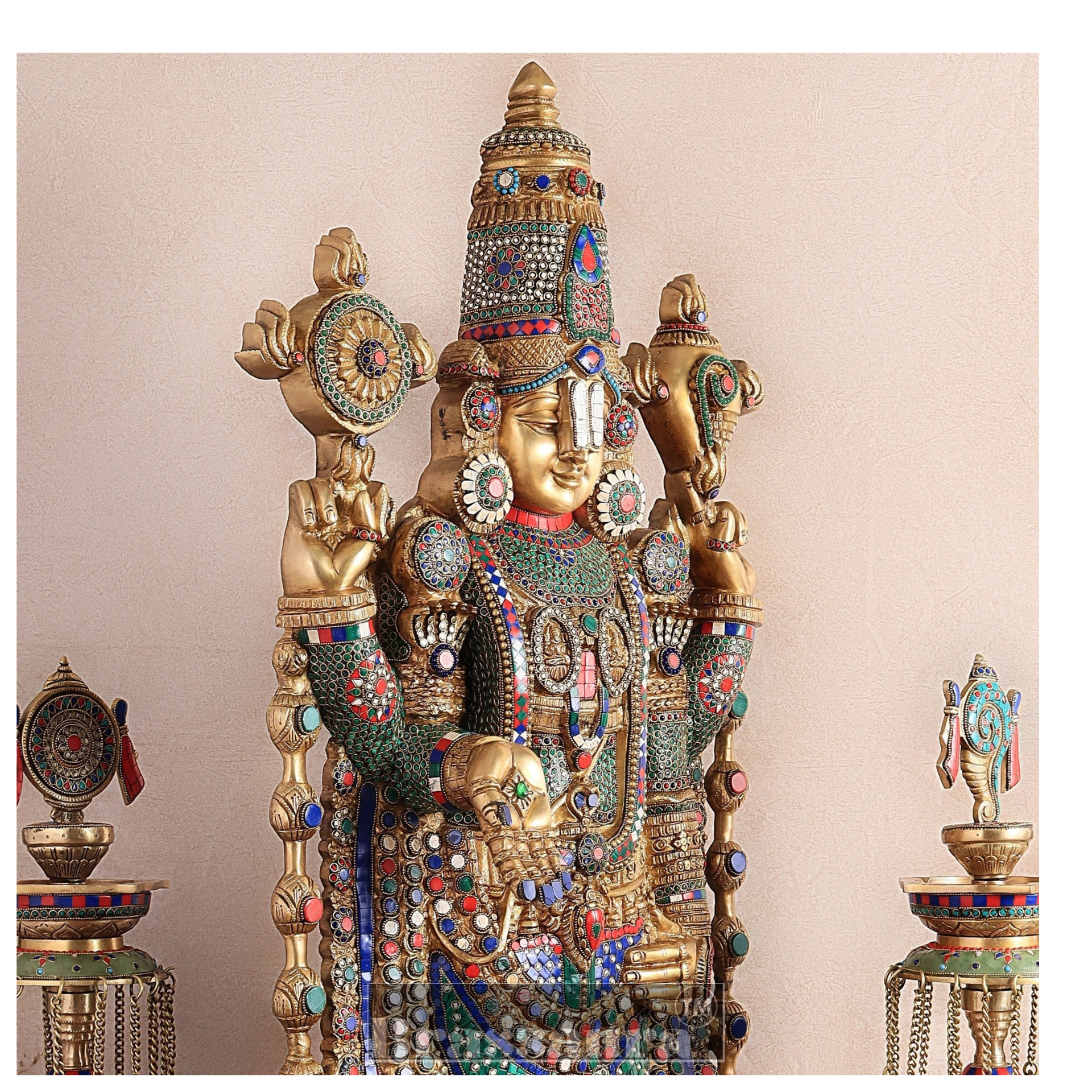Brassaura™ Brass Lord Venkateshwara Statue with Meenakari Stonework & Deepak Set – 48 Inches, 49 Kgs Idol + 30 Inches, 20 Kgs Deepaks