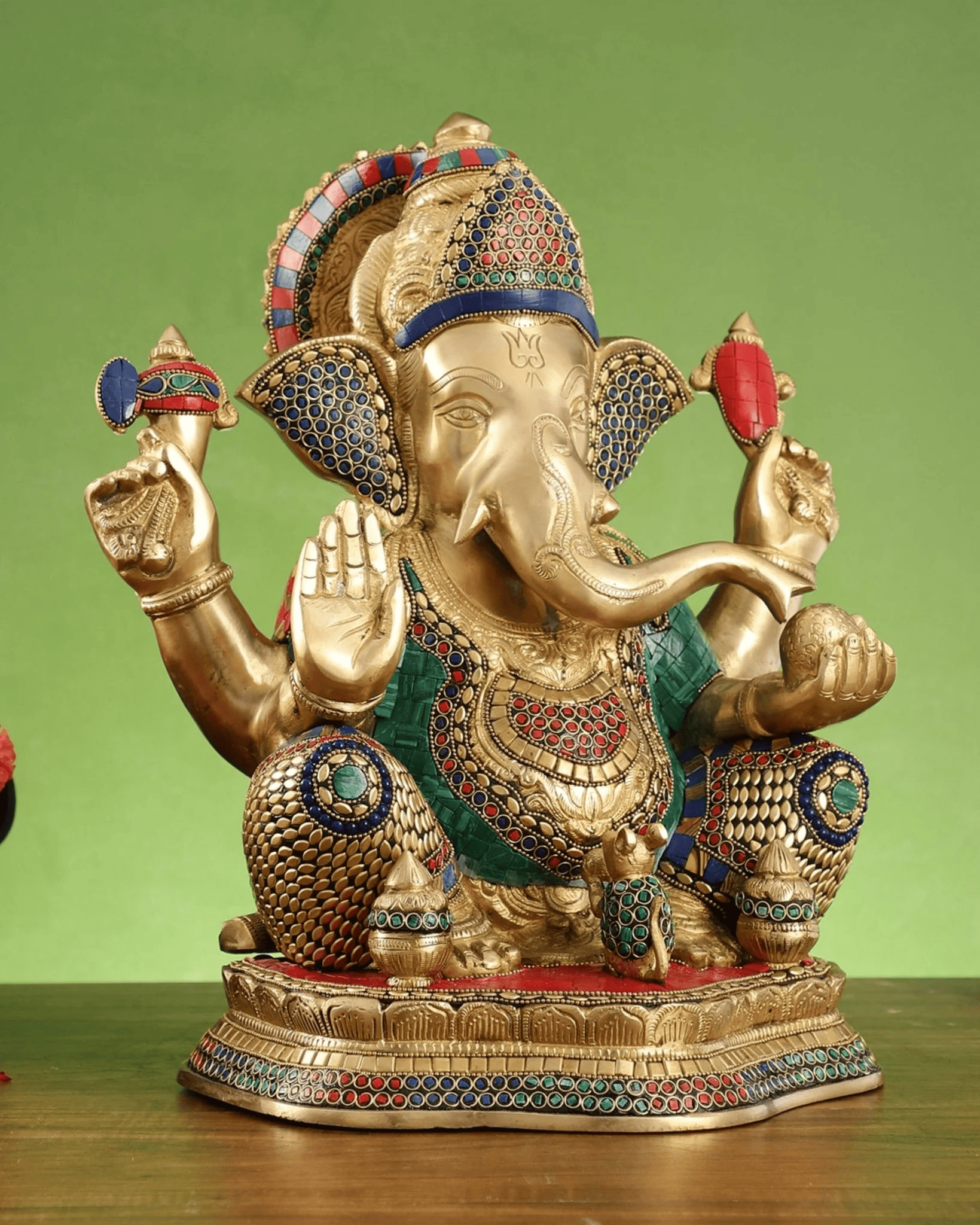 Embrace the divine presence of Lord Ganapathi with this exquisite handcrafted brass statue. Beautifully adorned with natural stones, brass rings, and brass chips, this masterpiece depicts Lord Ganesha seated gracefully with his vehicle, the mooshak, and a kalash — symbolizing wisdom, prosperity, and purity.