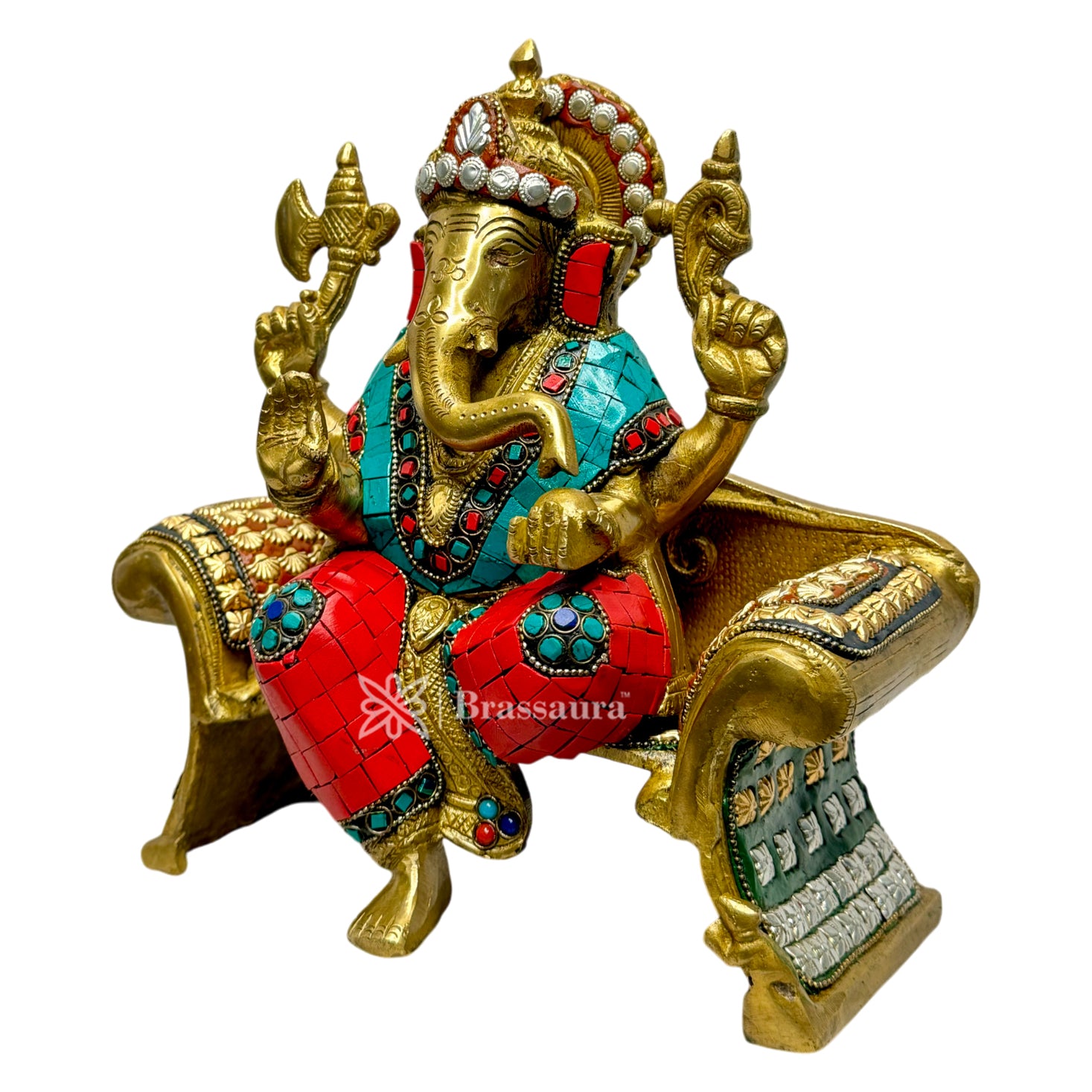 Brassaura™ Brass Multi Gem Stone Work Ganesha Murti – Height 9.4 inches & Weight 5.7 kgs | Ganpati Idol for Pooja & Home Décor
