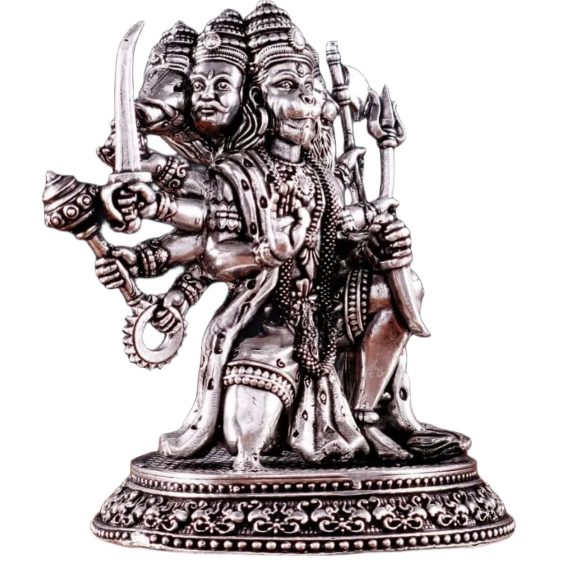 Brassaura™ Pure Brass Silver-Plated Panchmukhi Hanuman Idol – Height 4.5 Inches & Weight 450g | Handcrafted Miniature Idol