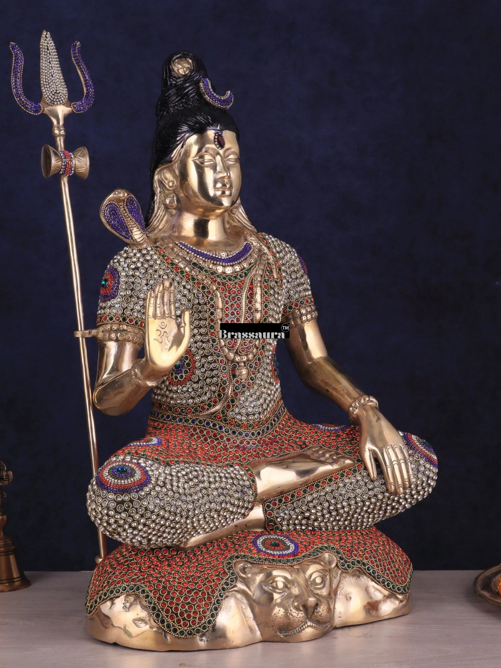 Brassaura™ Brass Gem Stone Work Shiva Idol – Height 23 Inches & Weight 18 Kgs | Traditional Pooja Décor