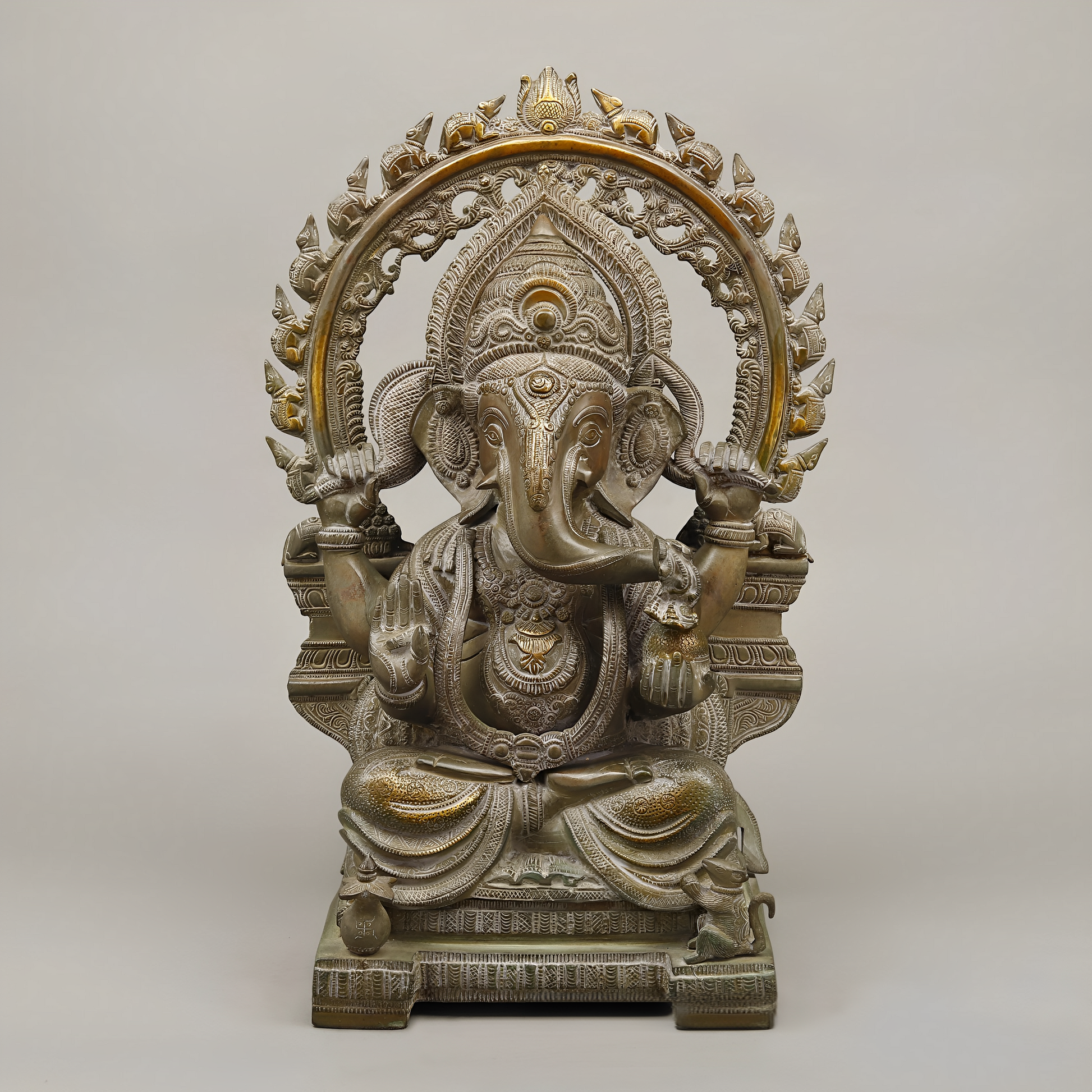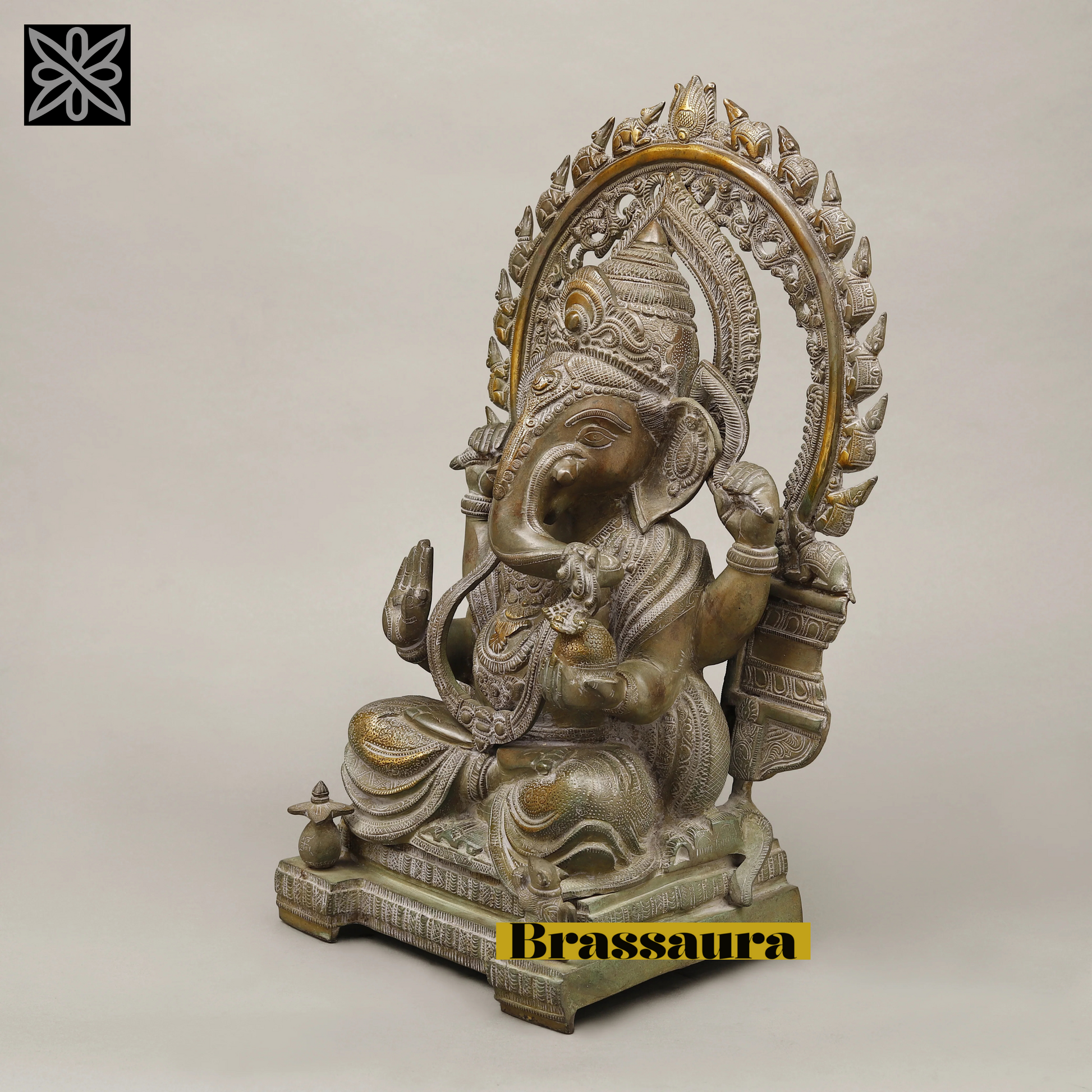 Brassaura™ Brass Ganesh Seated with Rat Frame – Green Antique Finish – Height 20 Inches, Weight 19.06 Kgs